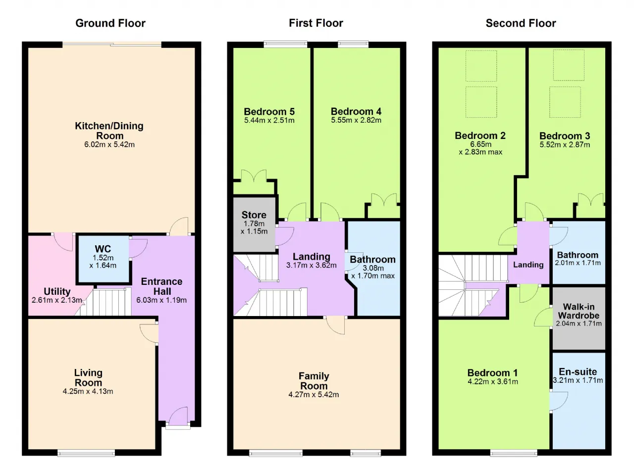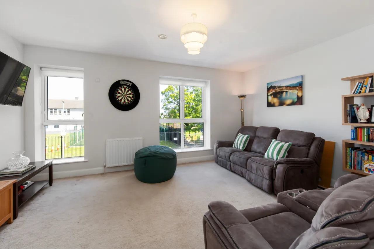 Family Room 4.27m x 5.42m spanning the entire width of the house, two large light bearing windows overlooking the playing fields