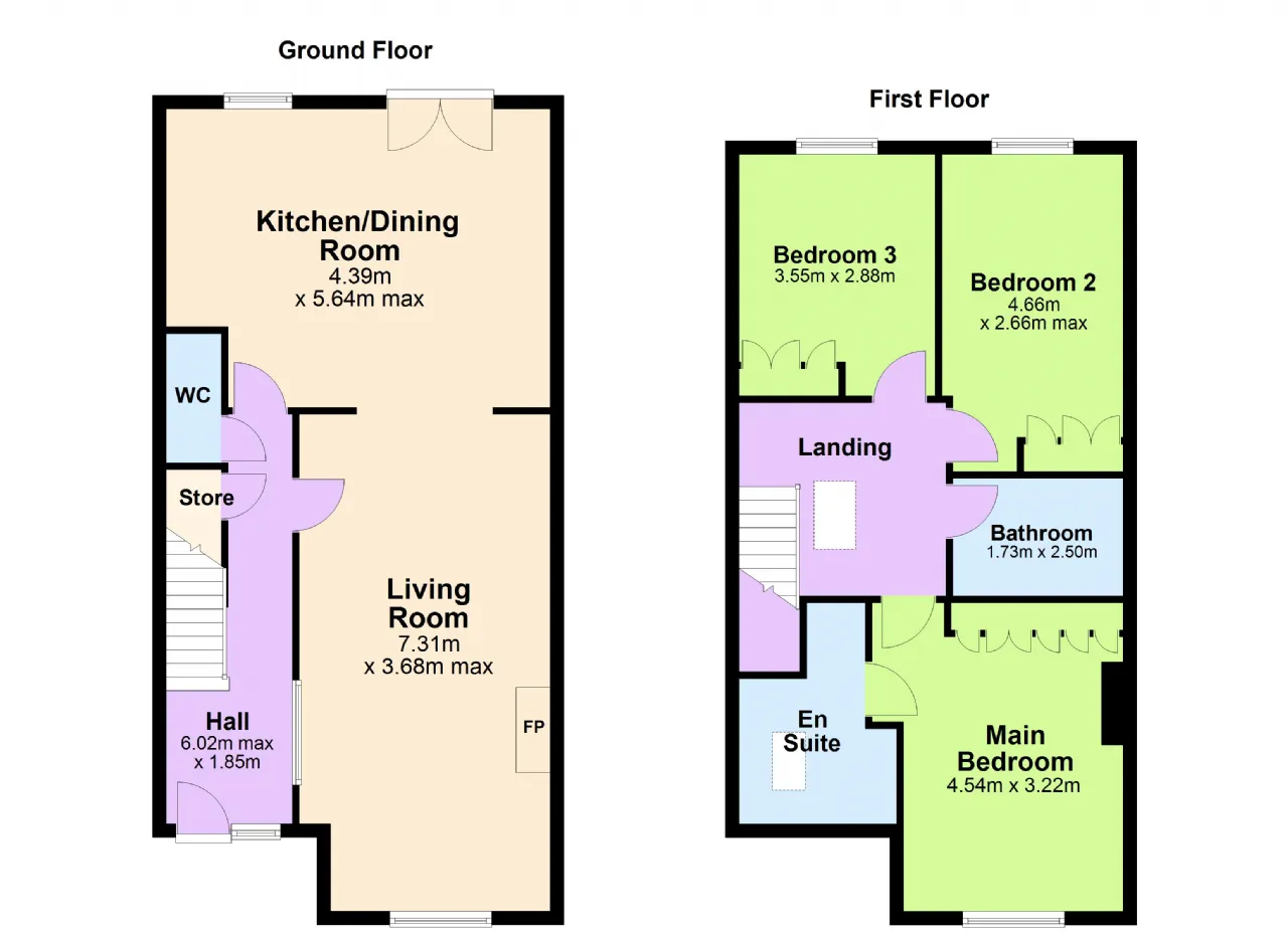 Upon entering, the hallway leads through to a bright and spacious living room, featuring dual aspect windows and a handsome fireplace with an electric coal-effect insert. The kitchen/dining area, fitted with Shaker-style wall and floor units, includes an integrated oven, gas hob, and freestanding fridge/freezer. Patio doors open to a private courtyard patio, perfect for outdoor dining, with the added benefit of a storage shed. A guest WC and understairs storage complete the ground floor accommodation.