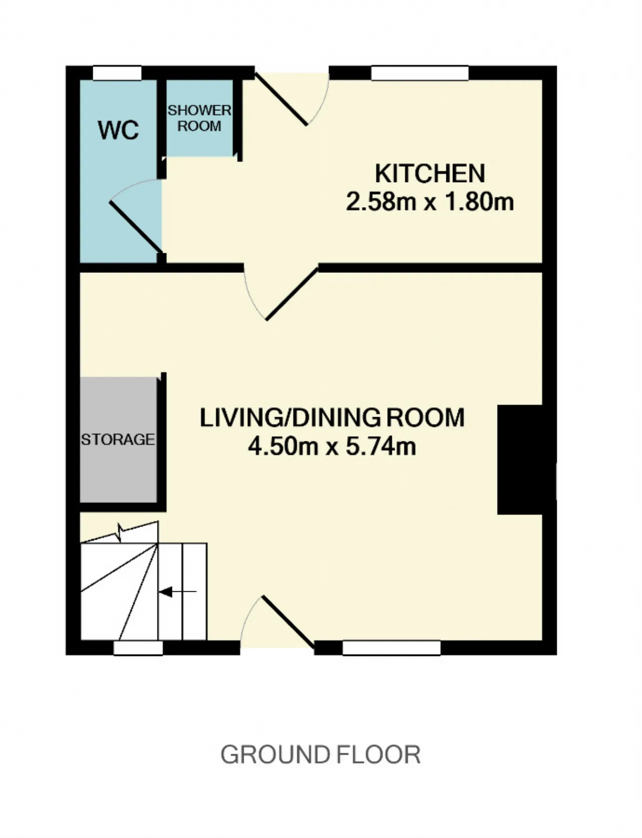Downstairs the off street parking leads up to the hall door, beyond which there is a large living / dining room with open fireplace. To the rear of this level there is a galley kitchen, w.c and shower cubicle. The kitchen leads out to the garden (20ft), which has its original granite wall across the back. A purchaser could extend into the garden as neighbouring houses have done (subject to planning permission). Upstairs there are two bedrooms.