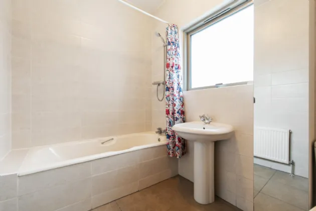 Bedroom 2 3.75m x 3.61m tiled floor and tiled walls, bath with shower, sink, w.c.