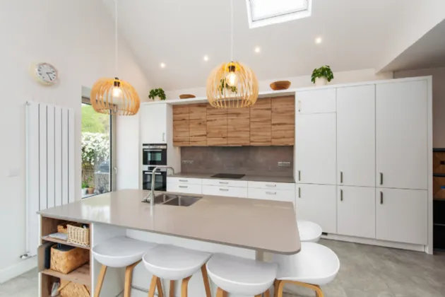 Kitchen/Dining: 4.02m x 5.60m excellent range of classic cream fitted kitchen units mixed in with Oak cabinetry which successfully creates an aesthetically pleasing break in the continuity of the cream and adds warmth to the kitchen, granite countertop, four ring electric hob, extractor fan, double oven, integrated fridge/freezer, double height ceiling, tiled floor, island unit incorporating a breakfast counter with granite countertop, integrated Neff dishwasher, pull out bin and display shelving, window seat with under seat storage, recessed lighting, Velux window and sliding door to garden