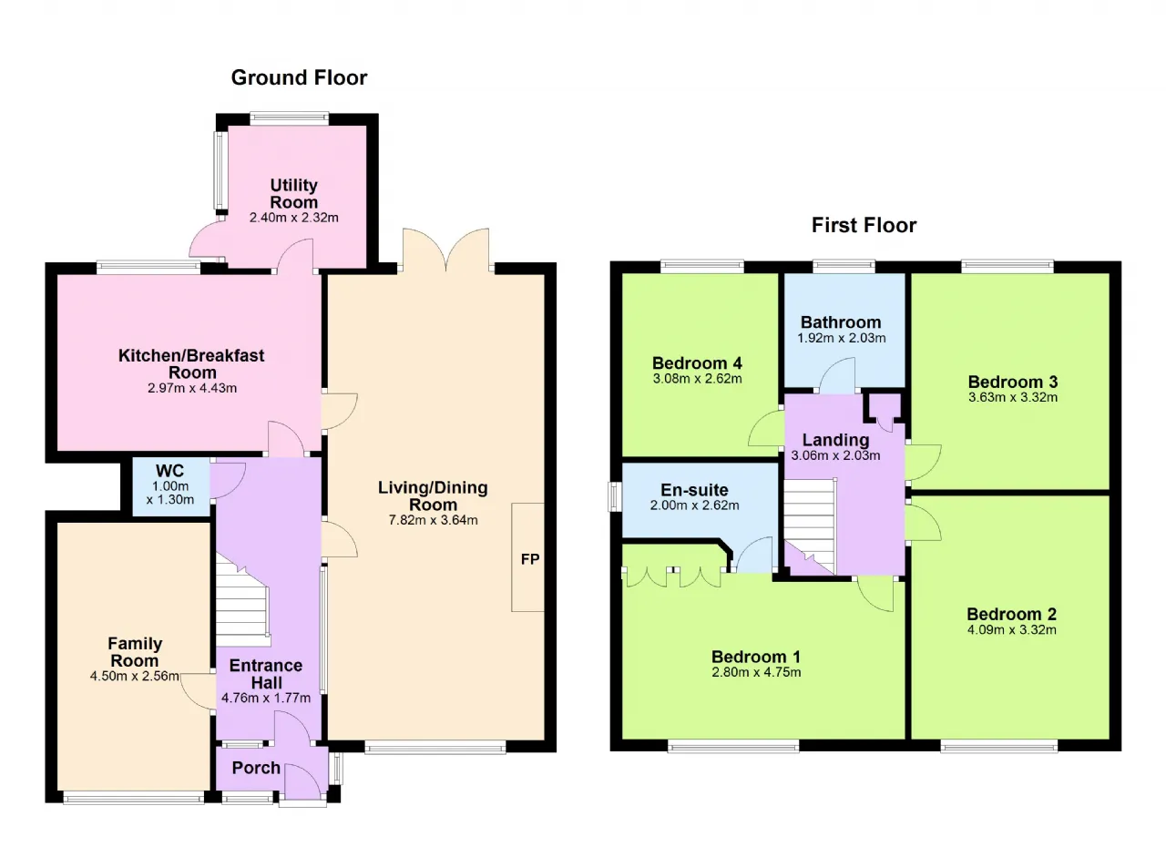 Living/ Dining Room 7.82m x 3.64m Solid wood flooring, feature open fireplace, dual aspect, patio doors to rear garden.