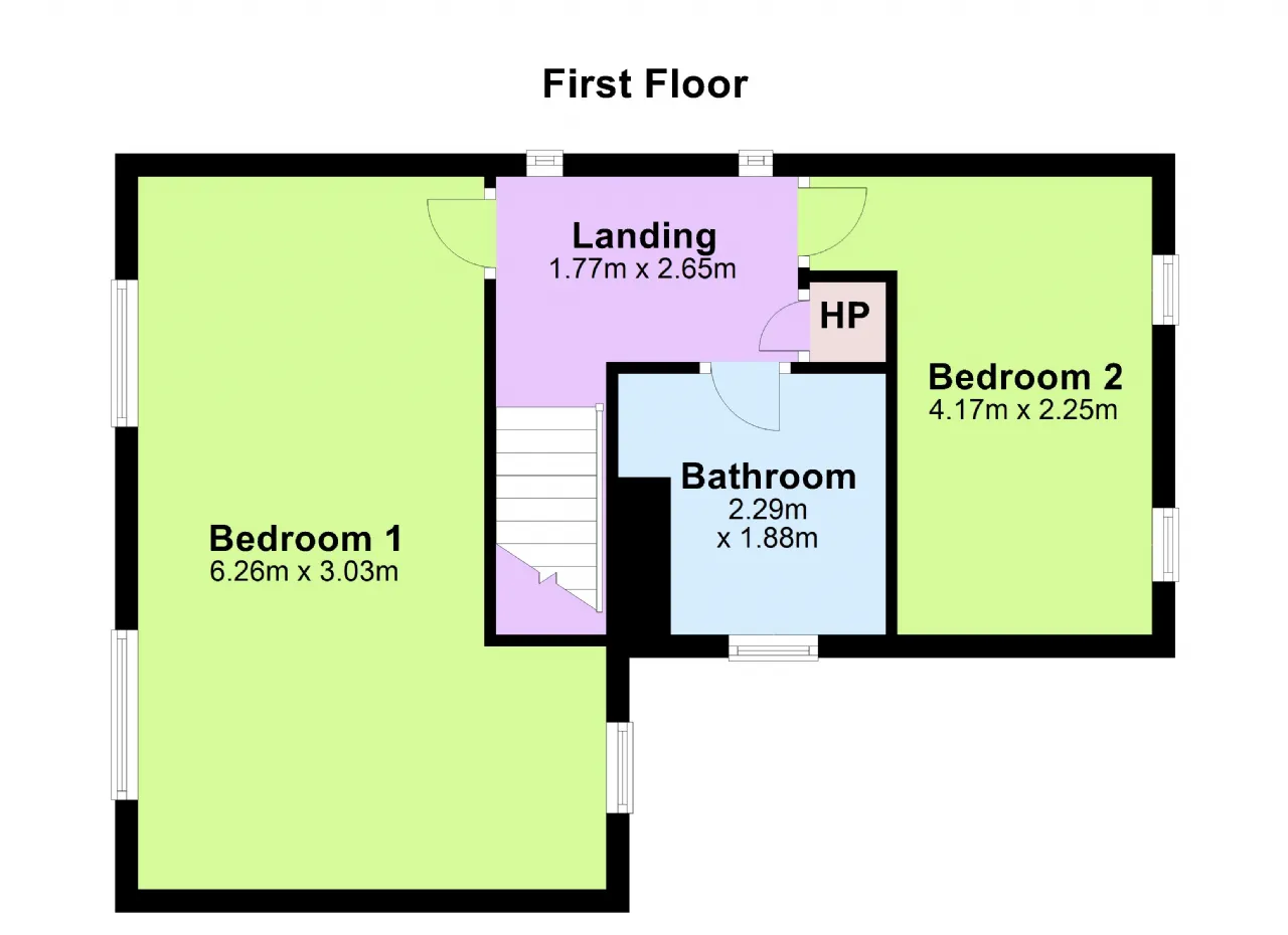 Bedroom 2 4.17m x 2.26m Second double bedroom with vinyl flooring, built in wardrobes, windows to the front.