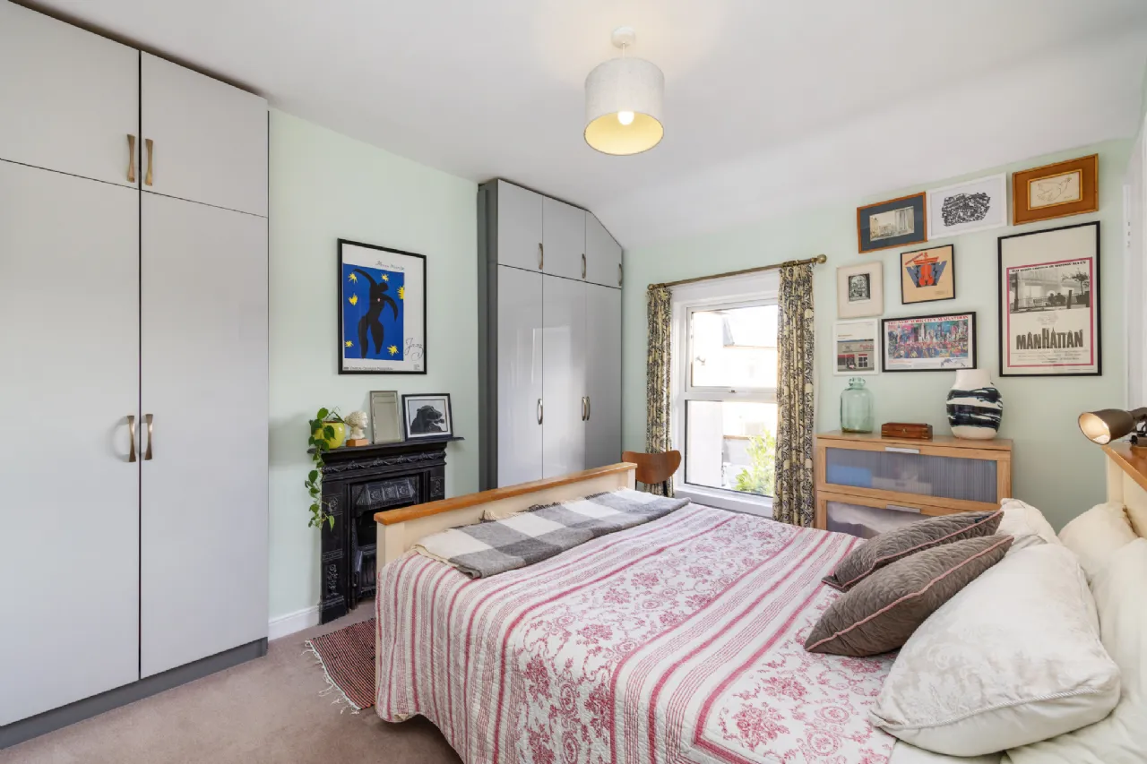 Bedroom 1 3.063m x 3.660m Spacious double bedroom positioned to the rear over-looking the garden, with ample built-in wardrobe storage, a cast iron fireplace, laid in wool carpet.
