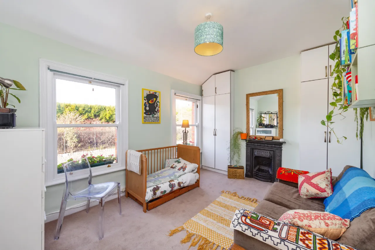Bedroom 2 4.337m x 3.073m Wonderfully spacious double bedroom spanning the full width of the house to the front with dual sash windows, currently in use as a nursery, with built-in wardrobes, cast iron fireplace and wool carpet. A Stira ladder provides access to the attic storage that benefits from natural light through Velux windows.