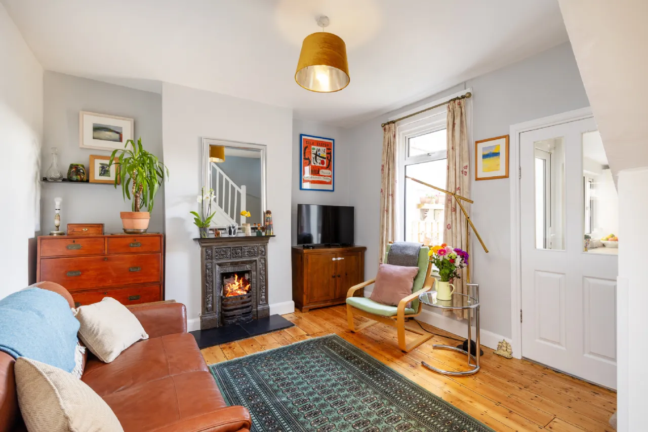 Living Room 4.353m x 3.641m Main reception room overlooking the rear garden with an original wooden floor, open fire with an attractive cast iron fireplace, open to the kitchen, with under stairs storage.