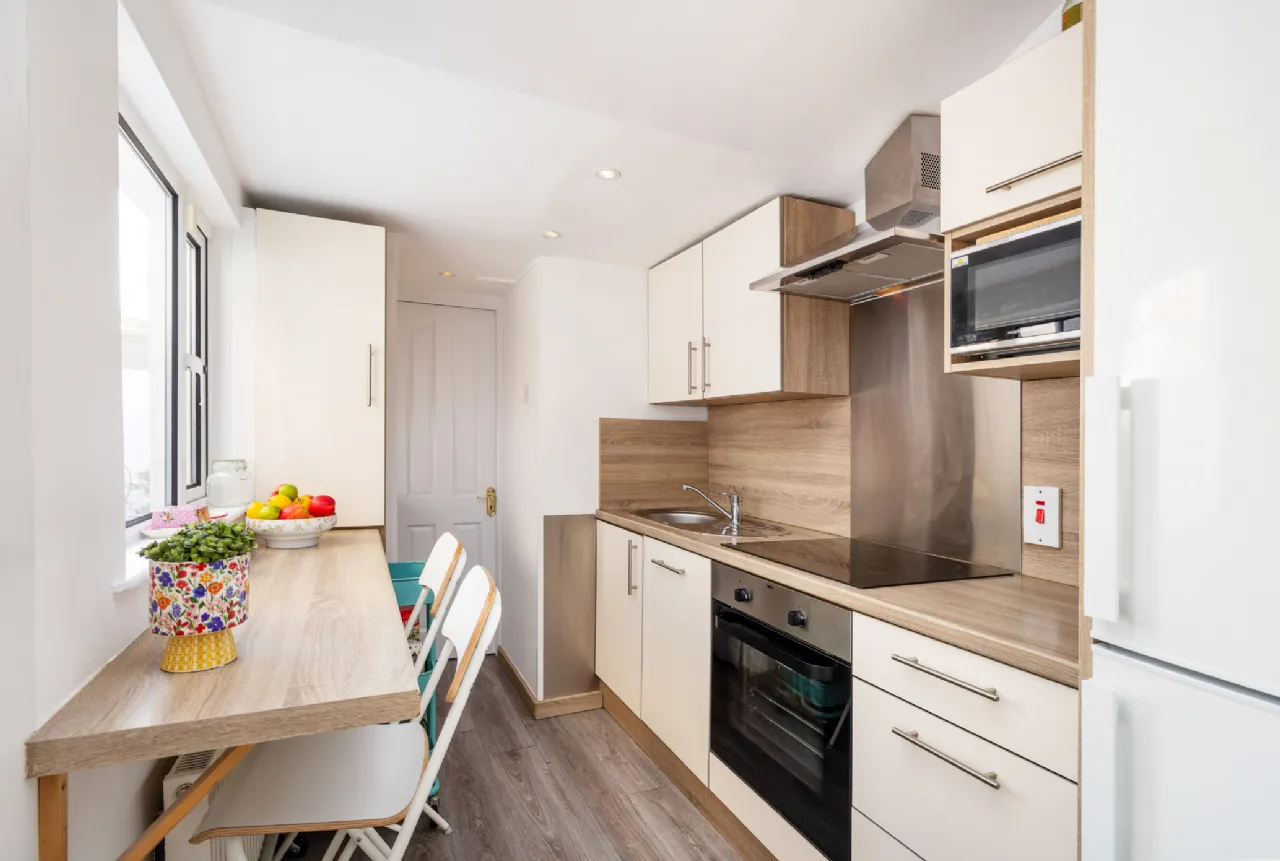 Kitchen 2.019m x 3.580m Well-appointed galley kitchen off the living room with a laminate wooden floor, ample storage in the floor and wall-mounted units, a neat breakfast bar, electric oven & hob with a stainless steel splashback, utility area with a washing machine. The kitchen also provides direct access to the rear garden.