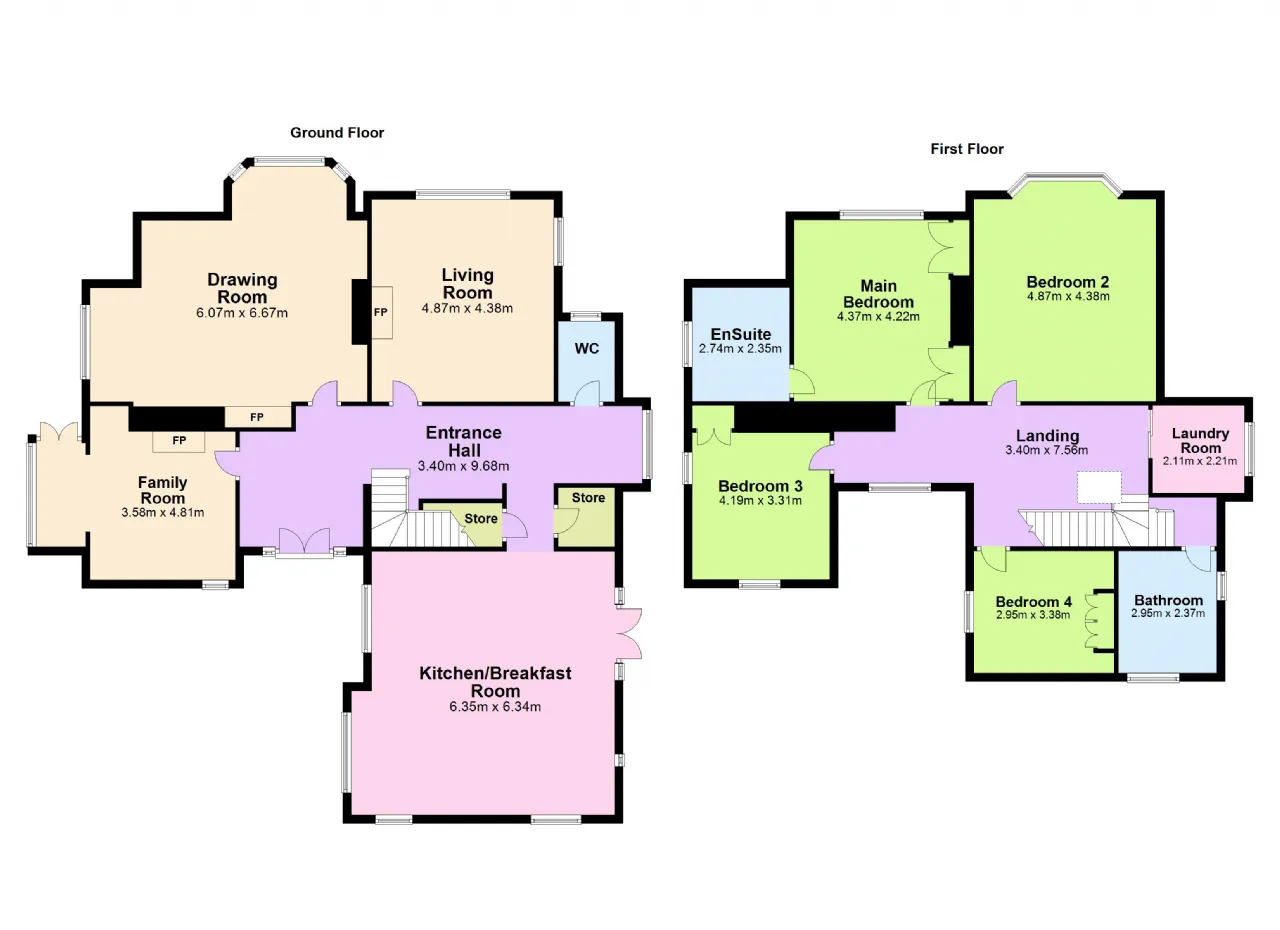 On the first floor we have a spacious gallery landing with Velux windows and a generous main family bathroom off the return: the attractive stained-glass door was once the main hall door of the house. The principal bedroom features a sun drenched south facing aspect and a bespoke ensuite shower room with built in wardrobes. There are three other generous bedrooms some with dual aspect and again featuring bespoke built-in wardrobes. a large laundry room is also at this level.