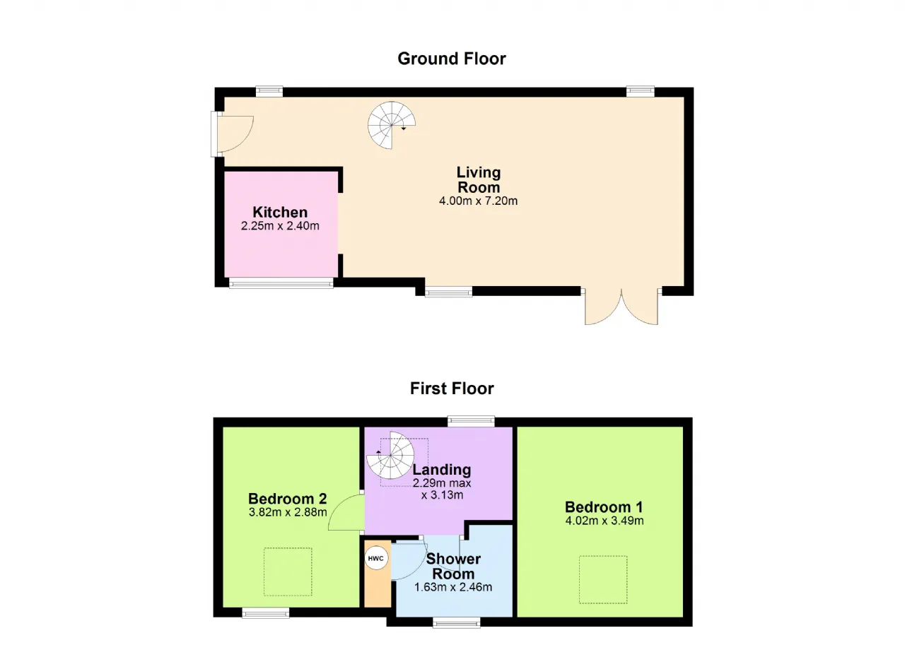 Living Room: bright open space with Herringbone floor and French doors to the garden. Door to the side also. Spiral staircase to the first floor.
