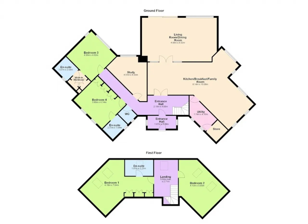 Upstairs, the main bedroom suite is a luxurious haven, boasting a bespoke dressing area and a beautifully appointed ensuite with double shower and high-end fittings. An additional double bedroom with fitted wardrobes and eaves storage, shares this level, along with a generous landing that easily accommodates a work-from-home space.