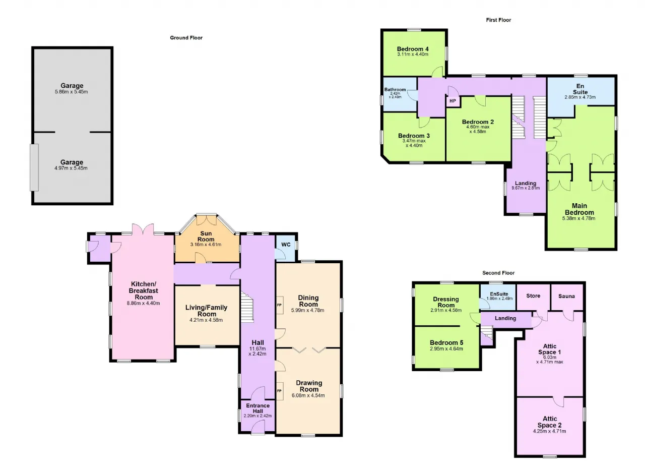 Upstairs, the accommodation offers impressive flexibility. The luxurious primary suite spans the depth of the house and includes a dual-aspect bedroom with views over the gardens, a spacious dressing room, and a large ensuite bathroom. Three further double bedrooms and a well-appointed family bathroom are found on the first return. The second return houses a fifth bedroom suite, complete with a private study/annex and ensuite shower room. A further return leads to a substantial attic, cleverly divided into two zones—ideal as a family recreation or games room.