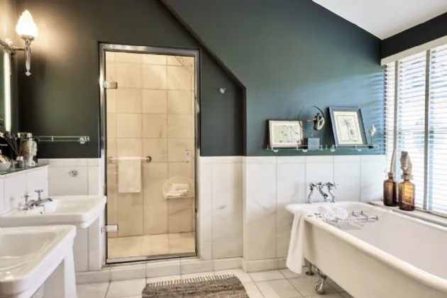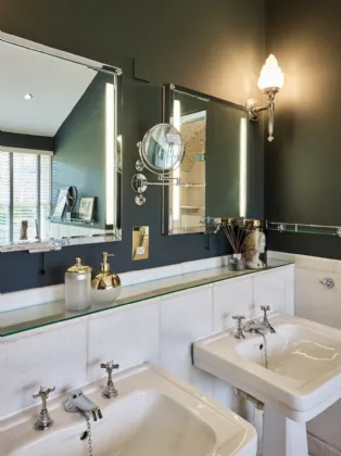 Family Bathroom White Czech & Speake suite incorporating a free standing clawfoot bath, a fully tiled shower unit with a rain head spray, dual pedestal wash hand basin and mirrors, bidet and wc. Marble tiled floors. Decorative wall lights, ceiling lighting, and recessed lighting. Large wall mirror.