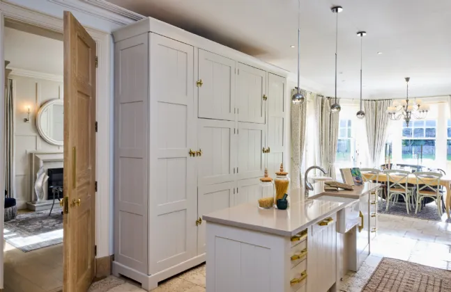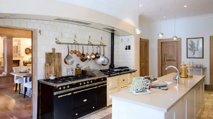 Kitchen/Breakfast Room Very fine range of hand-crafted fitted units providing an abundance of storage, complimented by an island unit with an Armitage Shanks Belfast sink with a marble top and drainer. Cooking and catering for family gatherings can be carried out on the five-door Aga, or on the Lacanche Cote D'or range with triple oven, warming drawer, five-ring gas hob and fryer. Decorative ceiling coving, pendant and recessed lighting. Quarry tiled floor. Bay window with views over the patio and gardens. Door to: