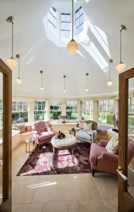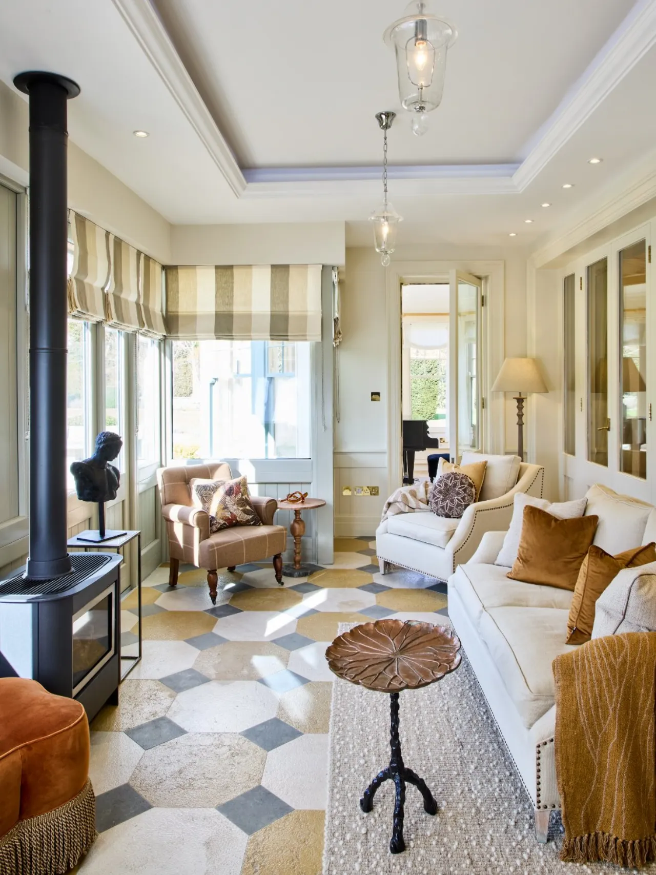 Sunroom View out to the gardens, accessed via French doors. Remote controlled Gazco stove. Recessed lighting detail and ceramic tiled floor. Door to: