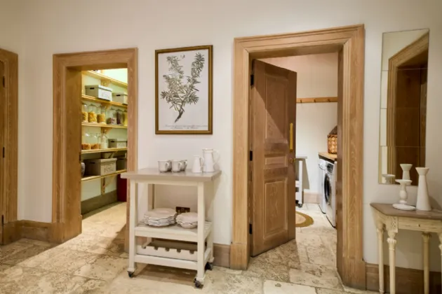 Utility Room Wall to wall floor to ceiling linen cupboards. Worktop area incorporating on Armitage Shanks Belfast sink and a washing machine and dryer. Shirt hanging rail and laundry chute. Quarry tiled floor.