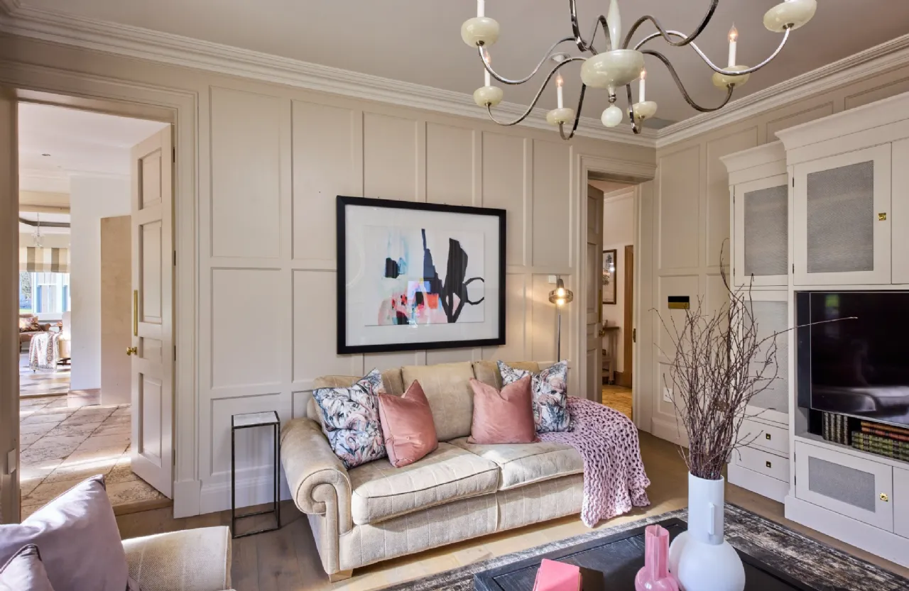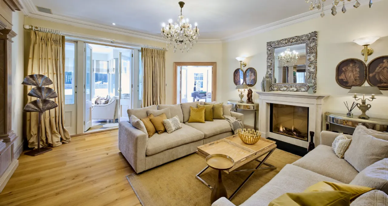 Family Room Wall to wall, floor to ceiling panelling. Custom designed library and entertainment unit. Feature marble fireplace incorporating a Gazco remote controlled log effect gas fire. Wide plank American oak floor. French doors to the patio and garden.