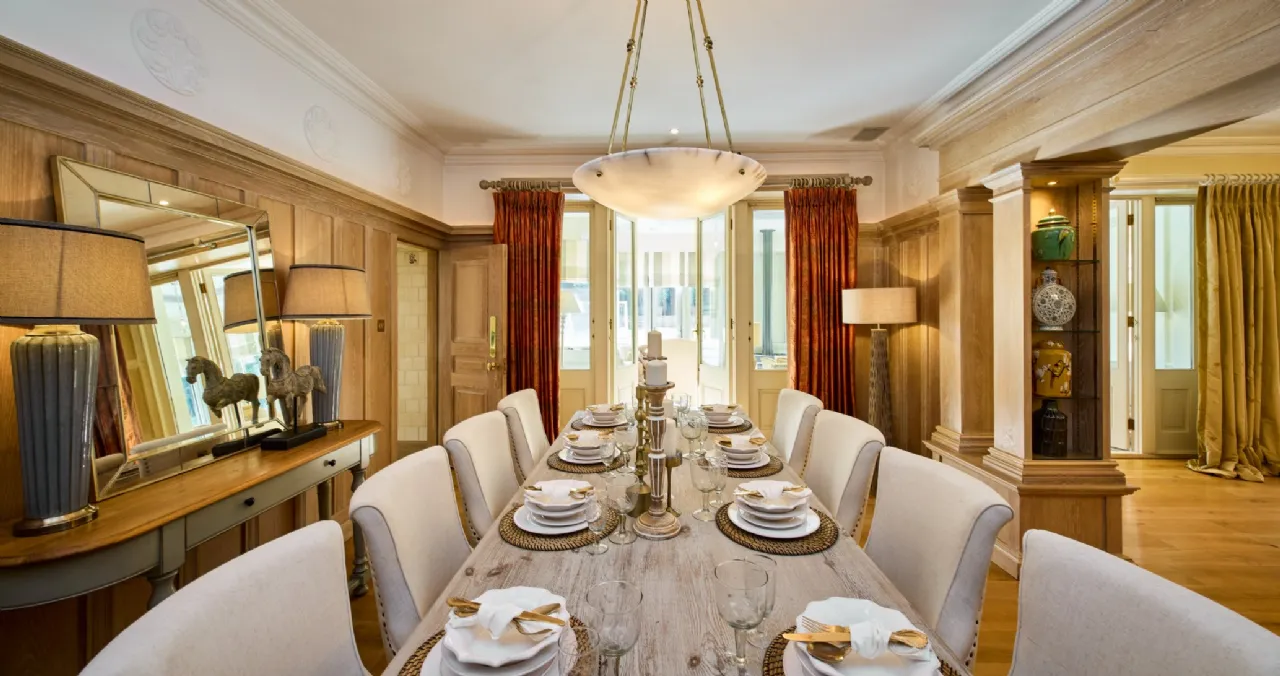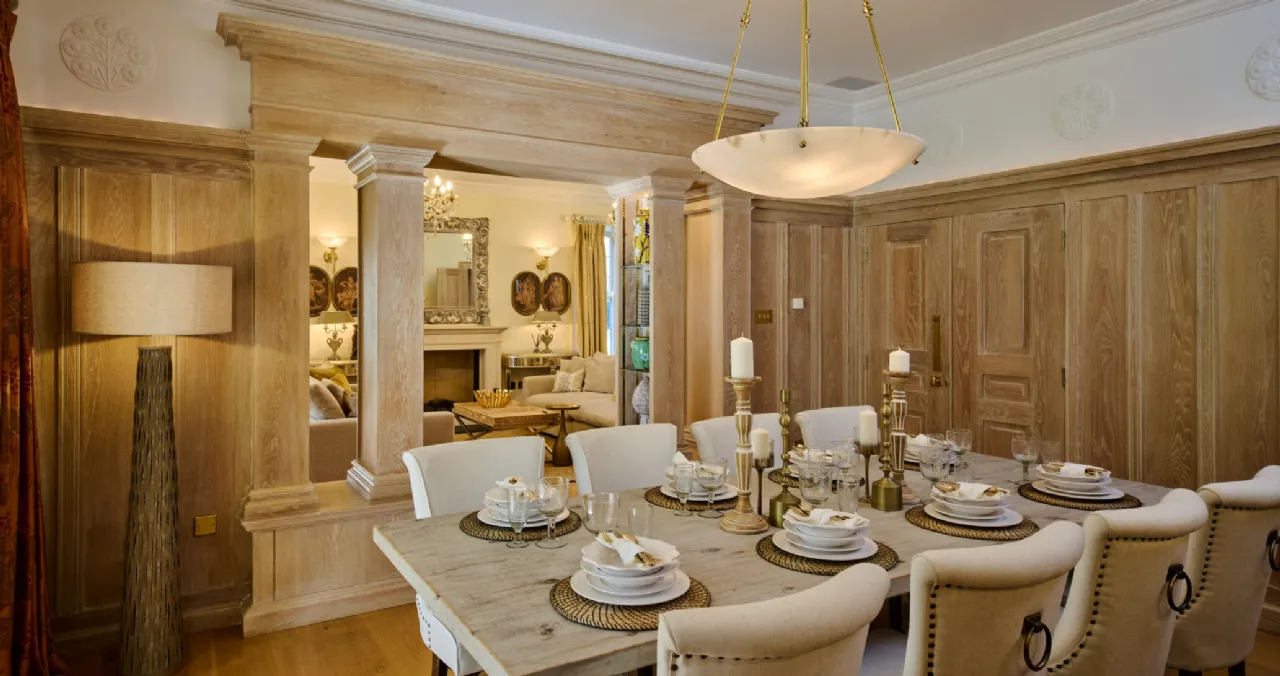 Dining Room Oak panelled room complimented by ornate, decorative plaster detail and coving. Wide plank oak floor. Opening into the kitchen/breakfast room and sunroom.