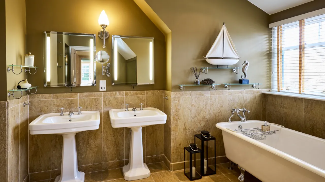 Guest Cloakroom White suite incorporating a pedestal wash hand basin and w.c. Decorative wall lights and ceiling coving. Tiled walls and floor.