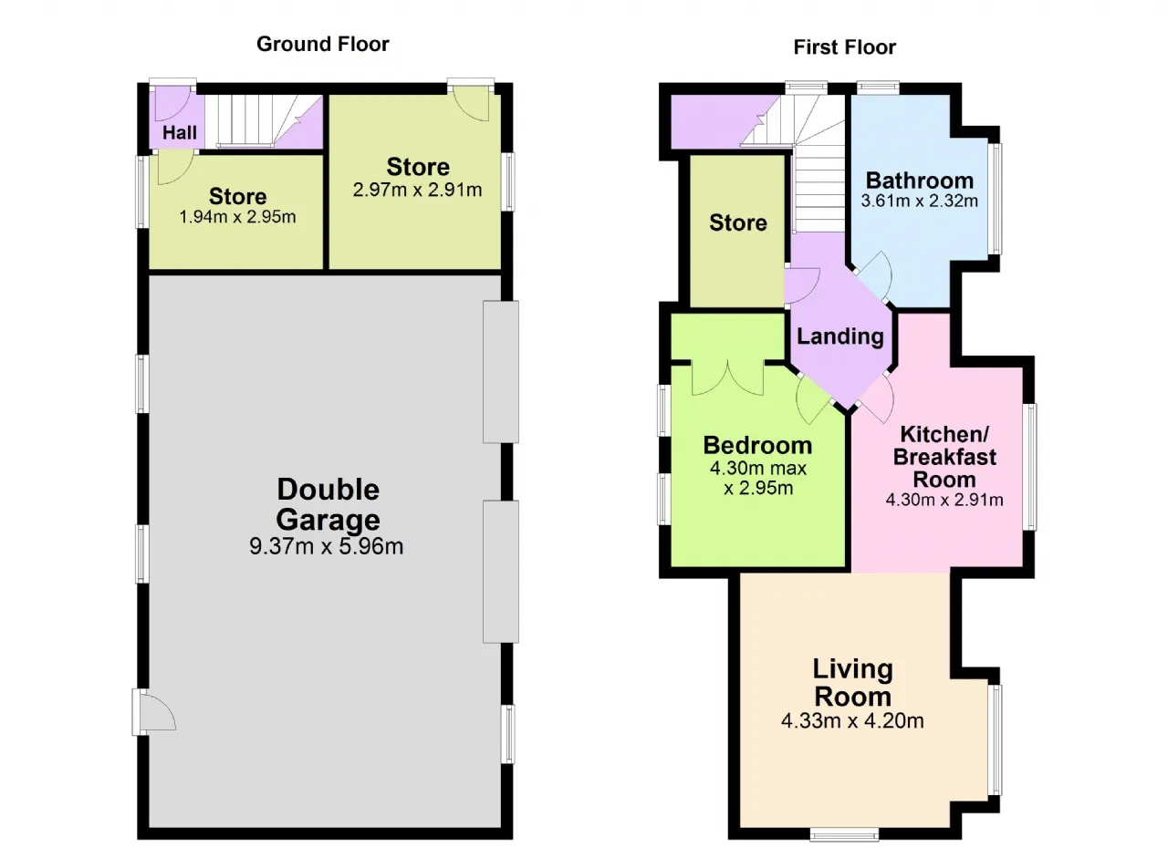Double Garage (9.35 sqm x 5.90 sqm) The double garage is accessed via dual remote controlled up and over doors. There are two EV charging points on the external wall. There is a self-contained one-bedroom apartment overhead.