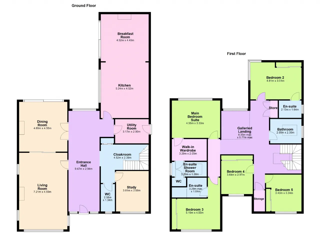 Upstairs the galleried landing lined with a glazed balustrade with oak handrail makes the most of the natural light streaming in from the double height window flooding this area with light at all times. There are five bedrooms on the first floor to include the main bedroom suite with his and hers wash hand basin, a separate toilet and dressing room. Three of the bedrooms have ensuite facilities and in addition there is a family bathroom with contemporary oval free standing bath.