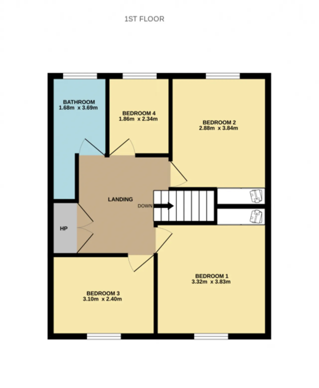 Bedroom 1 3.83m (12'7") x 3.32m (10'11") double bedroom located to the front of the house with carpet flooring and built in wardrobes.
