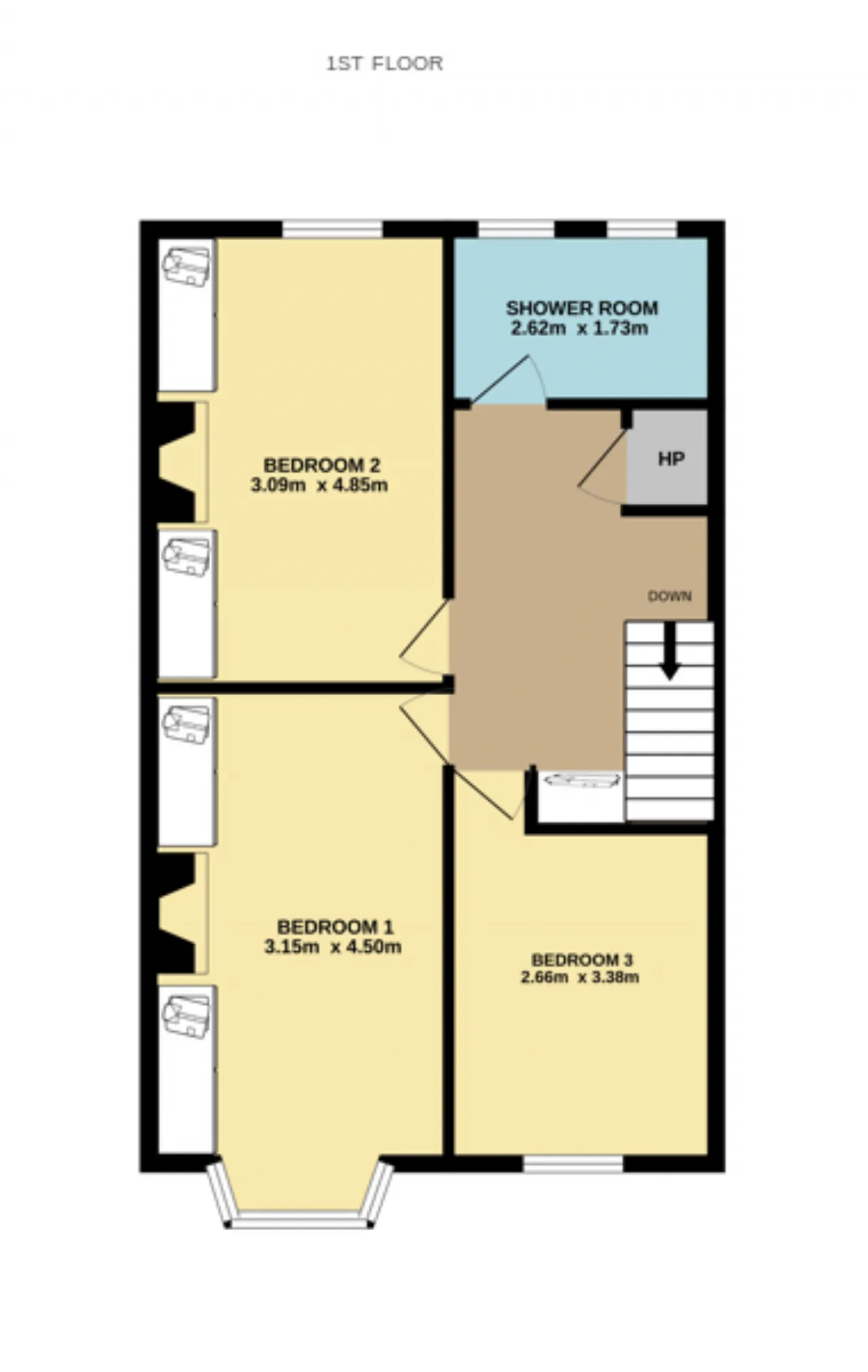 Bedroom One 4.50m x 3.15m with carpet flooring, built in wardrobes and bay window.