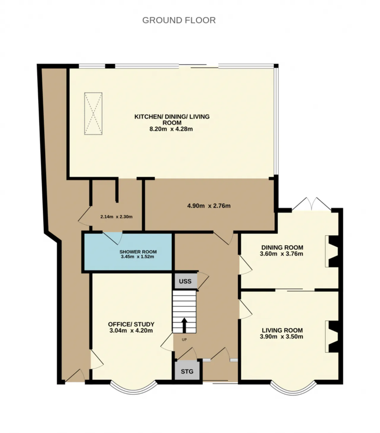 Kitchen/dining/living room: 8.20m x 4.28m Large open plan space, the living area is cosy with its free standing stove and wooden flooring. The dining area is light and bright with glass windows and doors overlooking the rear garden. The kitchen area features ample storage, granite work tops and is plumbed for a dish washer.