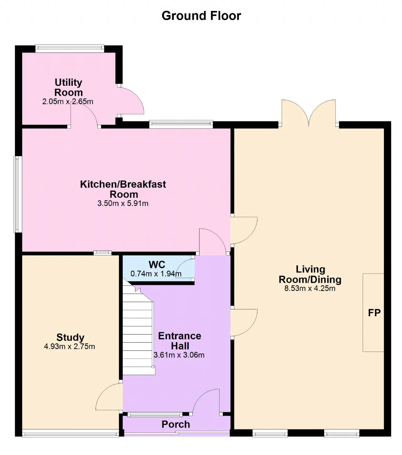 Study 4.93m x 2.75m overlooking the front of the property, timber flooring, dado rail, hatch opening to the kitchen.