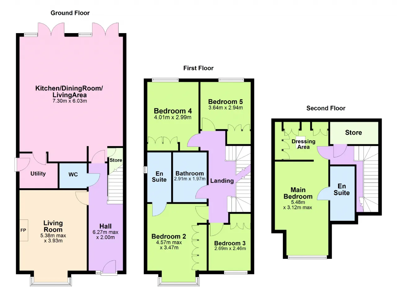 The first floor offers four generously proportioned bedrooms, each with built-in wardrobes, including one ensuite, along with a family bathroom. The second floor is home to the stunning principal suite, boasting a walk-in wardrobe area and a spacious ensuite, creating the perfect private retreat.