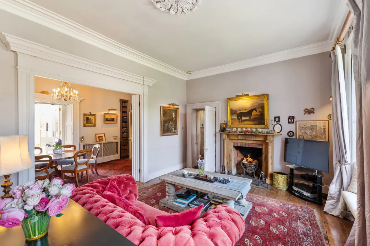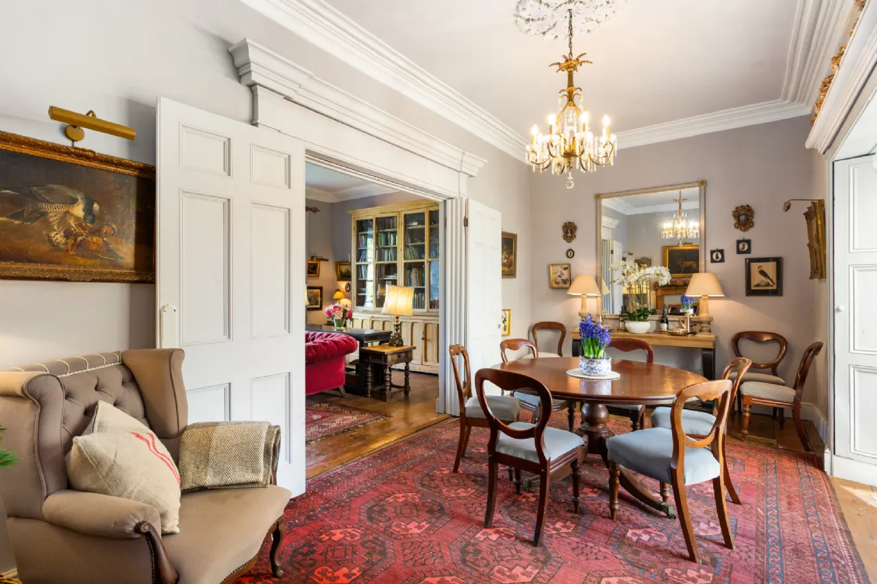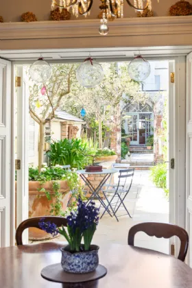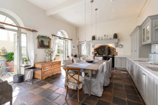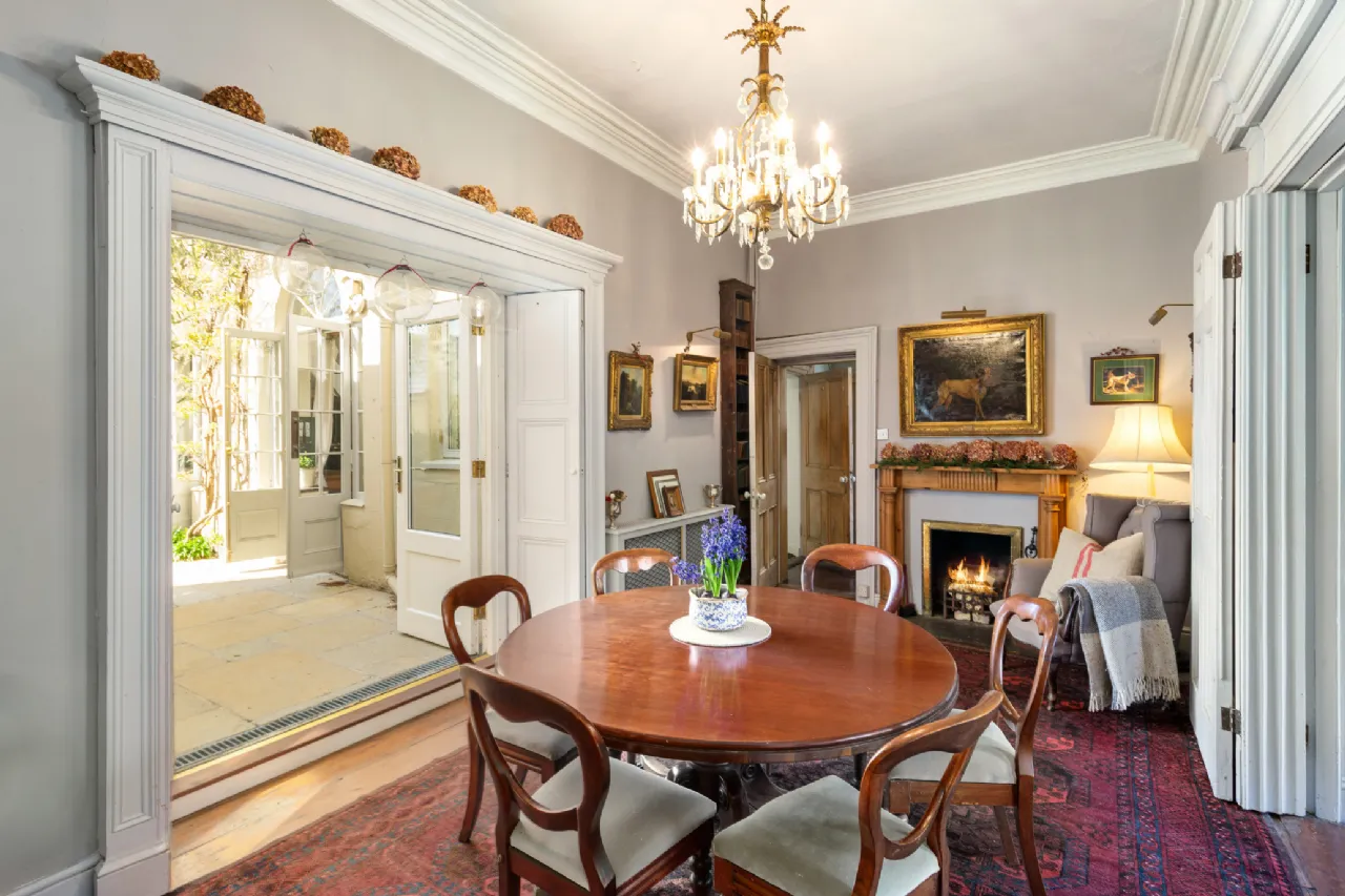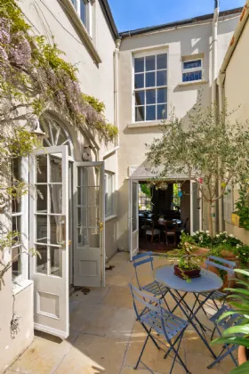 The entrance features a fan light and sidelights that radiate the hallway with abundant natural light. The quintessential 19th century drawing rooms overlooks the front garden and features two sash windows with working shutters and a detailed timber fireplace. Folding double doors with attractive architrave leads to the dining room with a similar matching feature fireplace. French doors open to the courtyard giving the first glance and sense of what awaits externally. Off the entrance hall is a guest WC and at the end of the hallway is a lobby with access to a Wet room and a door opening to the kitchen / breakfast room. The country style kitchen is undoubtedly the heart of this home, the original quarry tiled floors blend beautifully with the bespoke cabinetry painted in Farrow & Ball, Hardwicke White. There is plenty of storage space and the double larder cupboards with bi-fold doors are sure to impress as will the large AGA. Two sets of Venetian double doors open out to the courtyard with an attractive raised pond and the soothing sound of water trickling from the water feature completes this attractive setting. Off the kitchen is the garden room.