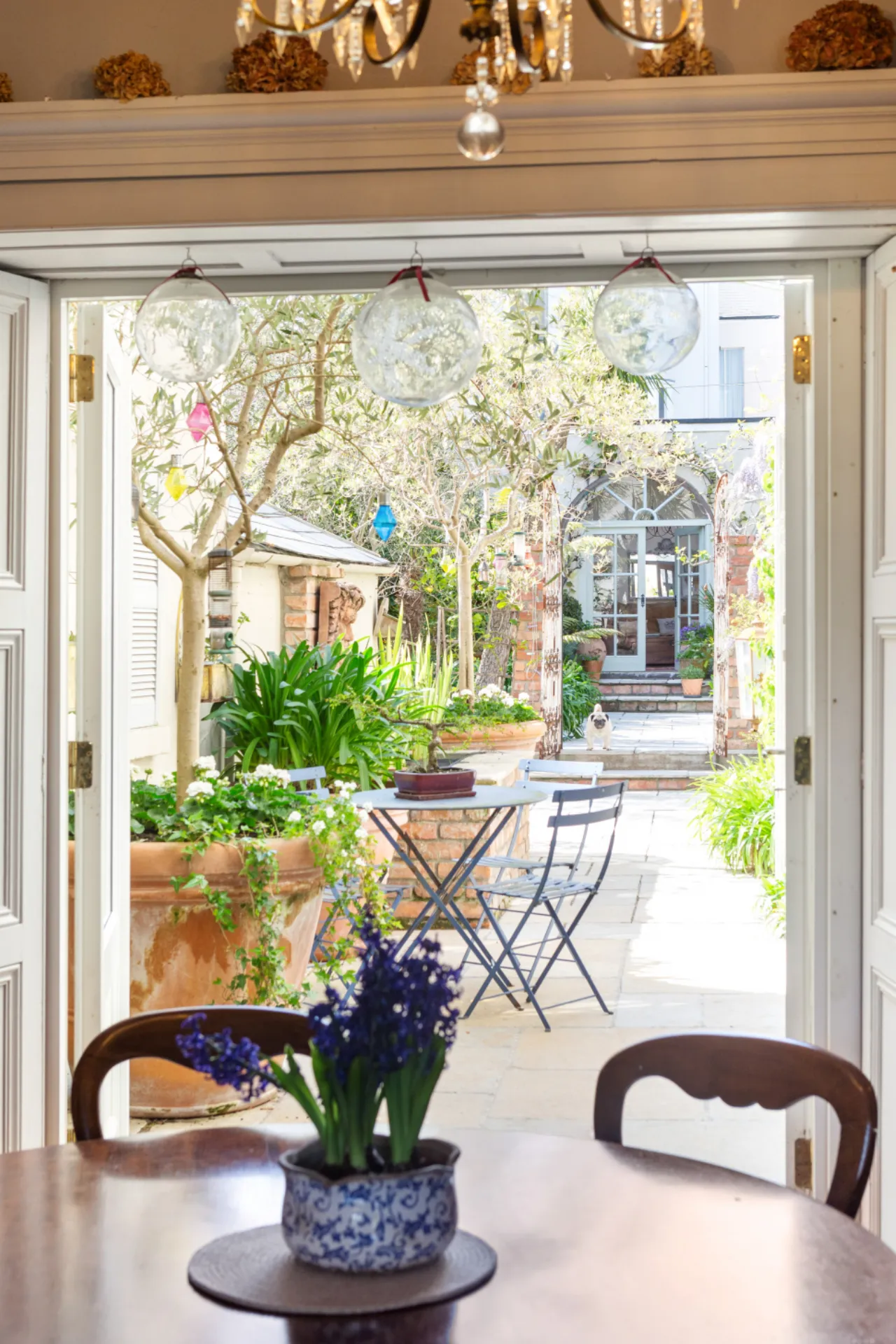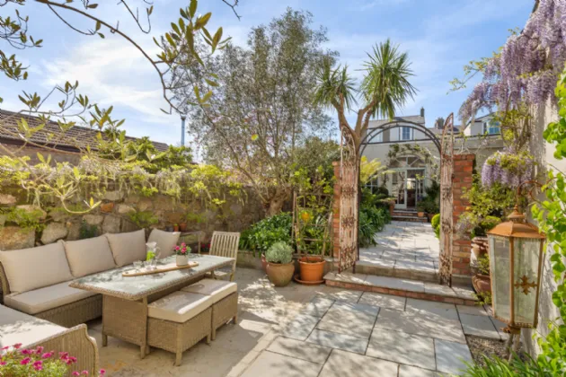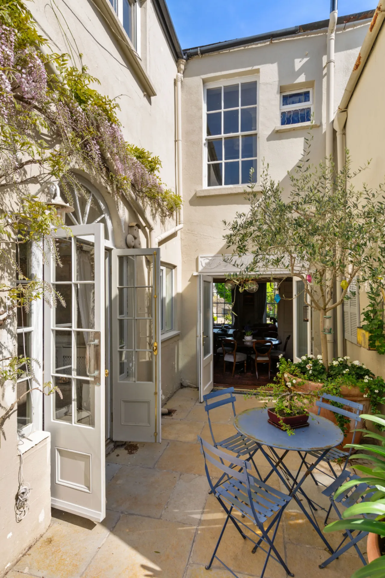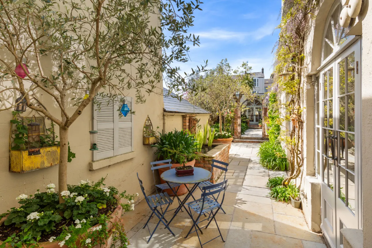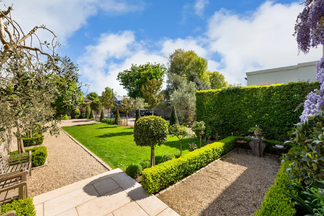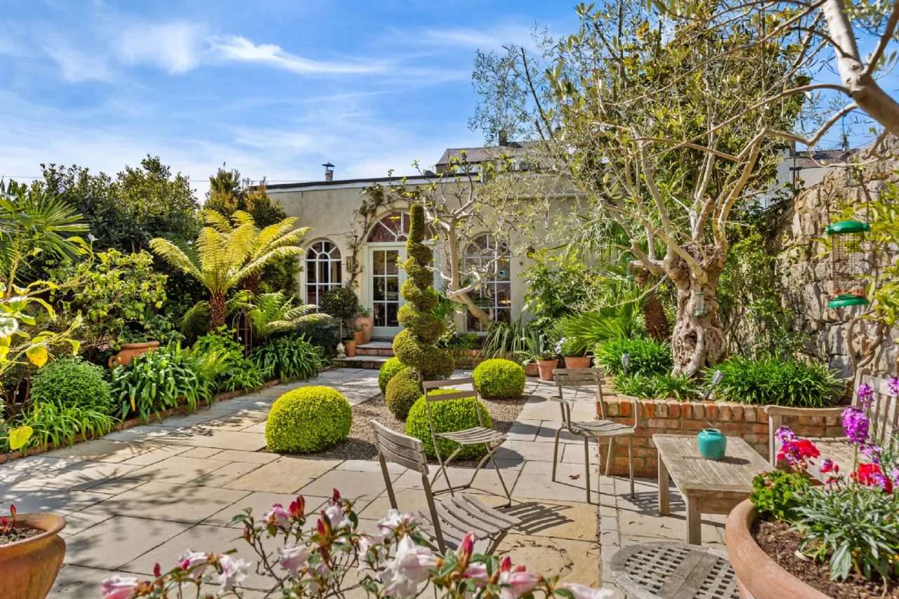 The gardens surrounding number five are truly a sight to behold. The owner, an avid gardener, has cultivated a stunning oasis. In the rear garden, one feels transported to the serene landscapes of the South of France, with its charming layout. The area features beautiful Tumbled Yellow Limestone paving, complete with seating spots designed to bask in the shifting sunlight. Lush flower beds are thoughtfully arranged to offer vibrant colors and visual interest throughout the year, showcasing a delightful mix of agapanthus in shades of white, light blue, and deep blue, along with elegant wisteria, olive trees, and a fig tree that bears fruit in August. At the heart of this enchanting garden, a spiral topiary is surrounded by four neatly trimmed box hedges, creating a focal point that enhances the garden's beauty.
