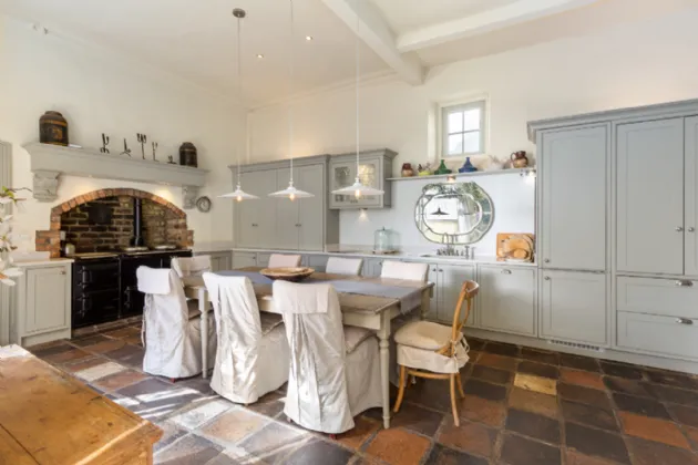 Kitchen/breakfast room 7.36m x 4.91m Quarry tiled floor, large aga with hot plates, brick exposed chimney breast, range of bespoke wall and floor mounted timber units painted in Farrow & Ball Hardwicke White with feature double larder cupboards, Siemens electric hob, granite countertop and splashback, inset sink unit. Two sets of Venetian double doors open out to the courtyard.