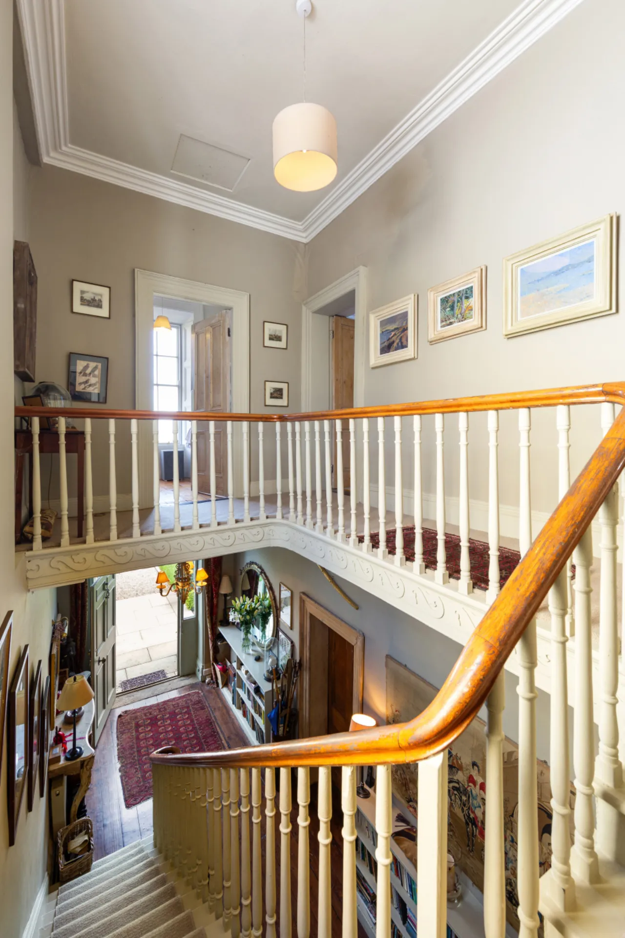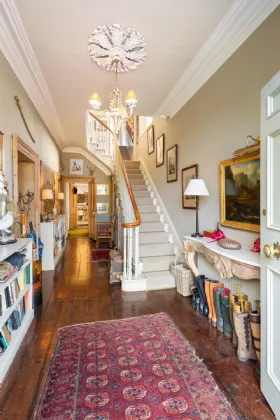 The staircase with mahogany handrail sweeps up to the galleried landing. To the front of the house is a large single bedroom and the principal bedroom with wall-to-wall wardrobes which has the benefit of a luxuriously appointed ensuite bathroom. There are two additional double bedrooms and a bathroom on the first-floor return.