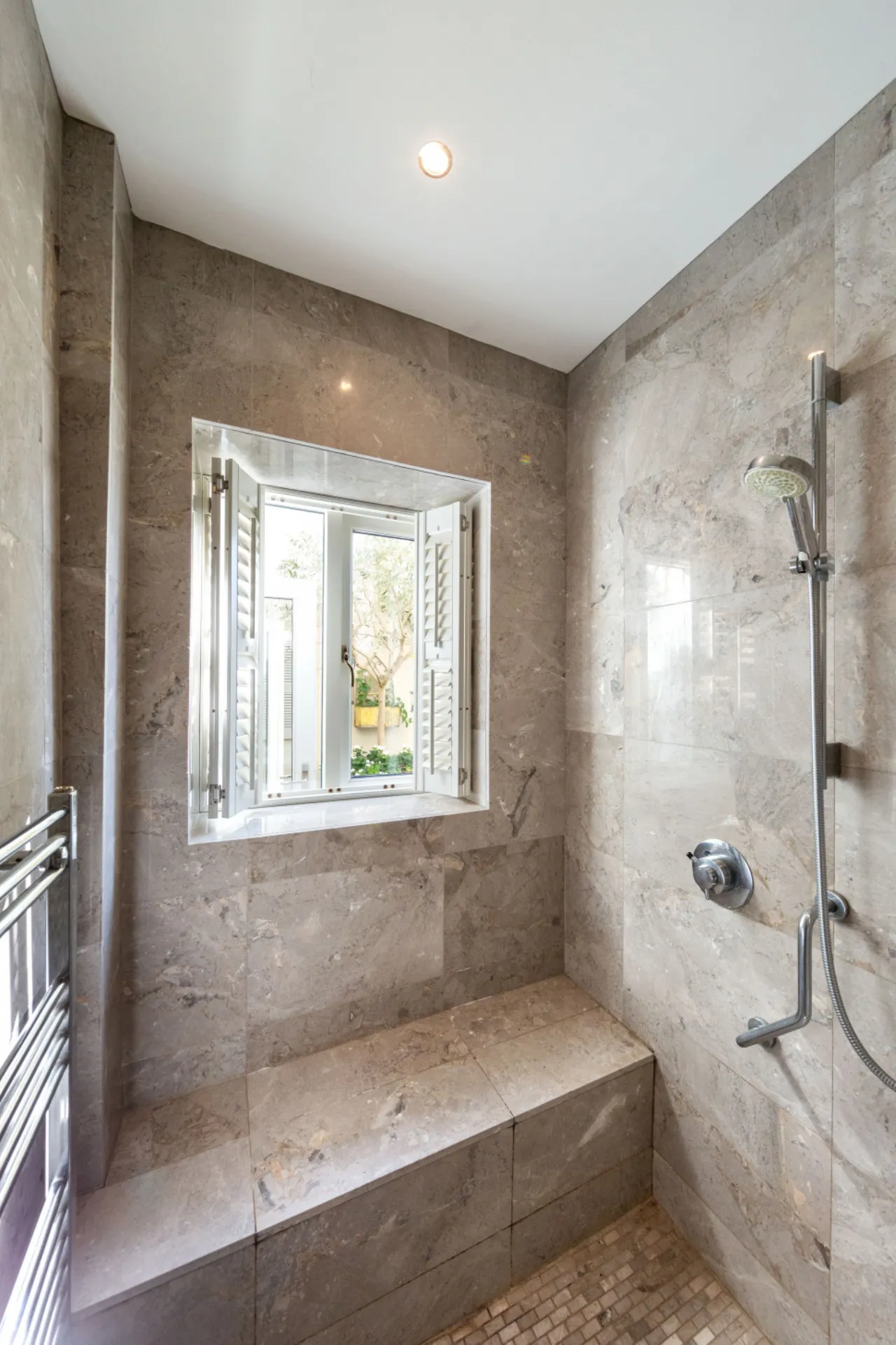 Wet room Fully tiled walls and floor, walk in wet area, heated towel rail.