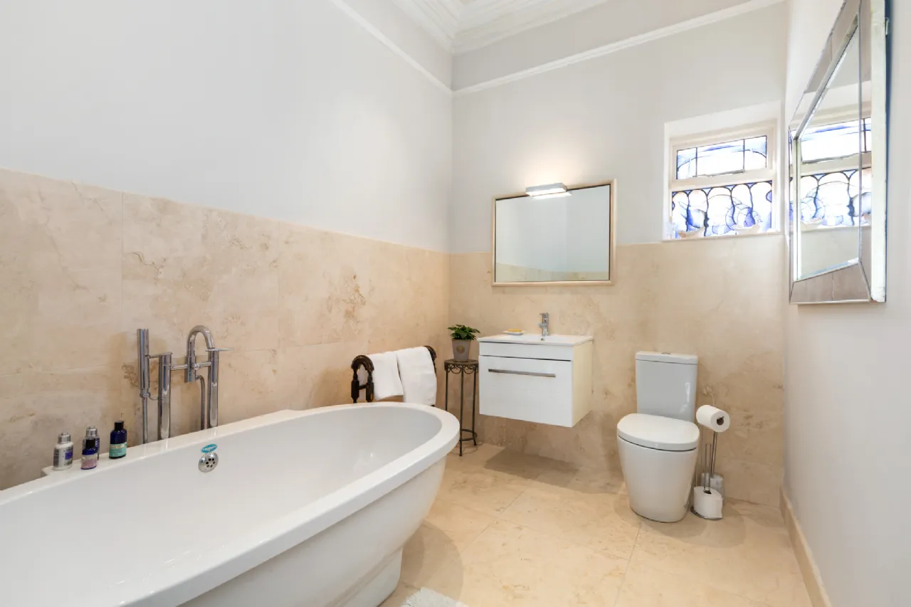 Ensuite bathroom 3.10m x 2.15m Stained glass window, slipper bath, wash hand basin inset in vanity unit with mirror and light over, WC, tiled floor and party tiled walls, ceiling coving, picture rail, recessed lighting.
