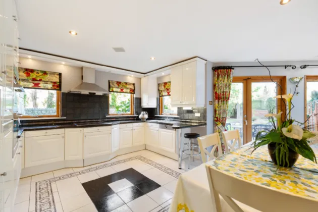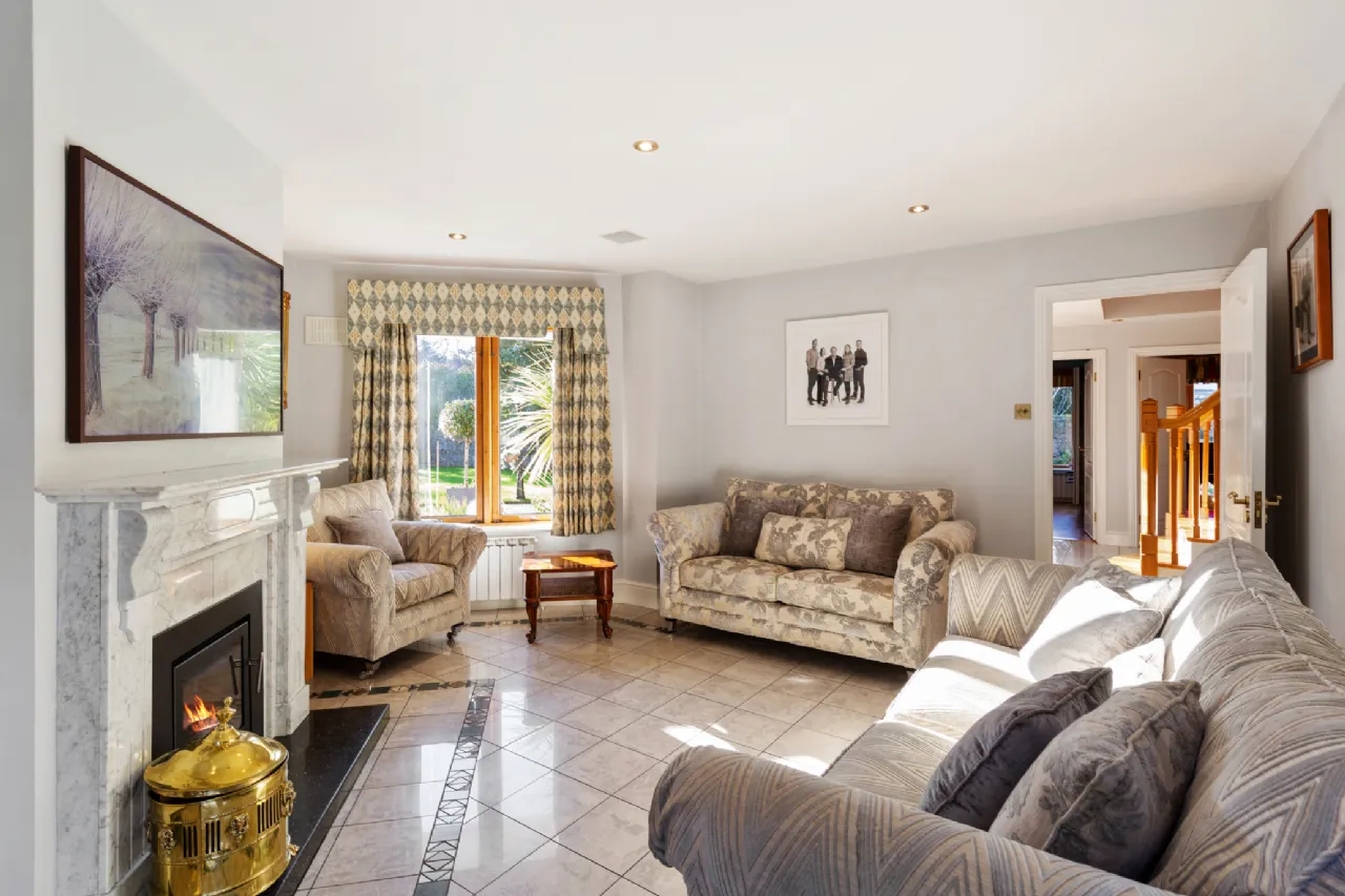 Family Room 4.45m x 6.90m Tiled floor, feature marble surround fireplace with multi fuel burning stove inset, recessed lighting, two sets of double doors to garden