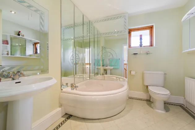 En-suite Tiled floor and part tiled walls, step in shower cubicle, w.c, w.h.b., two wall mounted vanity cabinets (Jack and Jill to bedroom five)