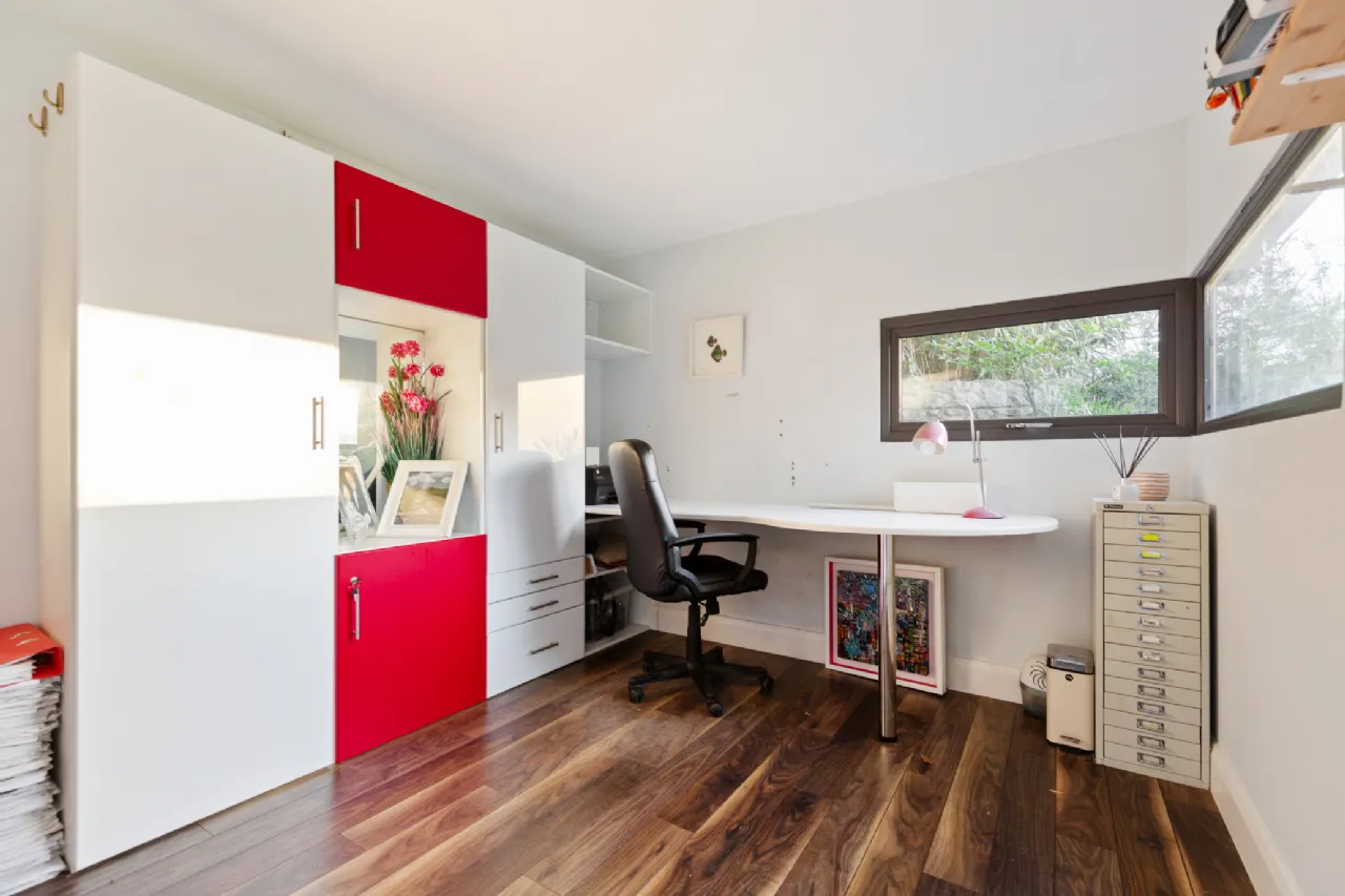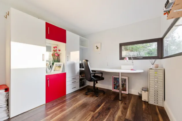 Study 4.29m x max 4.89m Wood floor, recessed lighting, built-in storage cabinet, feature portal window, dual aspect, recessed lighting, gas fire.