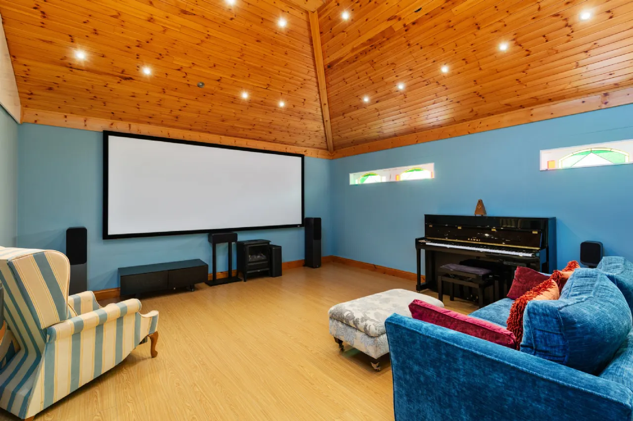 Converted garage Originally in use as a double garage (double doors still in situ), this area has now been adapted to create a cinema room with tall wood panelled vaulted ceiling incorporating two velux windows, recessed lighting, laminate wood floors, and a mezzanine area has also been created which is currently in use as a further study nook. The room also has a built-in storage closet