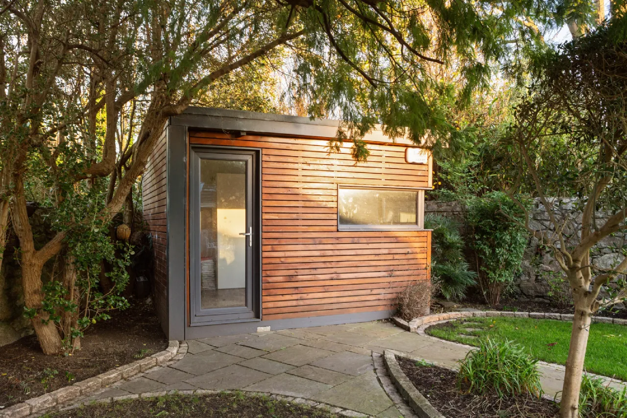 Shomera Garden office With timber panelled facade, laminate walnut flooring, with electricity and heating, built in storage and desk, fully insulated. Fully designed and fitted by Shomera.