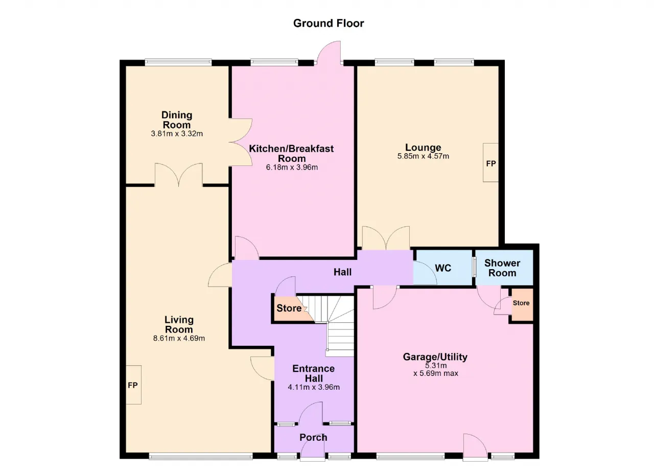 Entrance Hall 4.11m x 3.96m Carpet flooring, ceiling coving, wired for alarm, understairs storage.