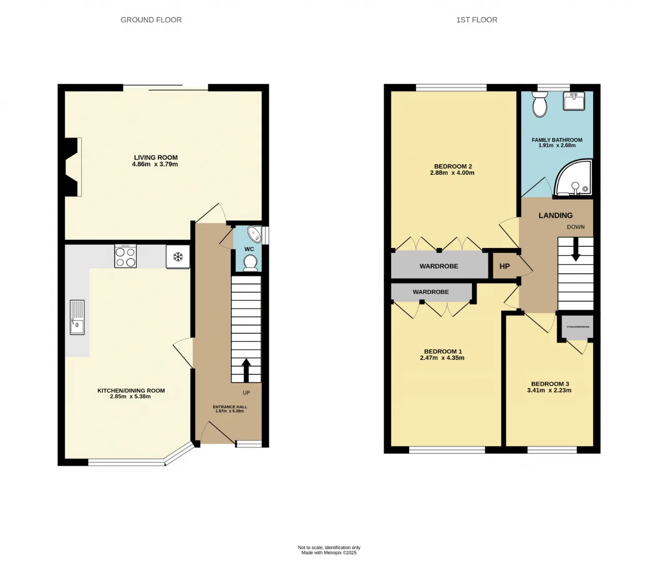 Bedroom 1 2.47m x 4.35m Generous double bedroom with front-facing window, built-in wardrobes, wall mounted radiator and laminate flooring.
