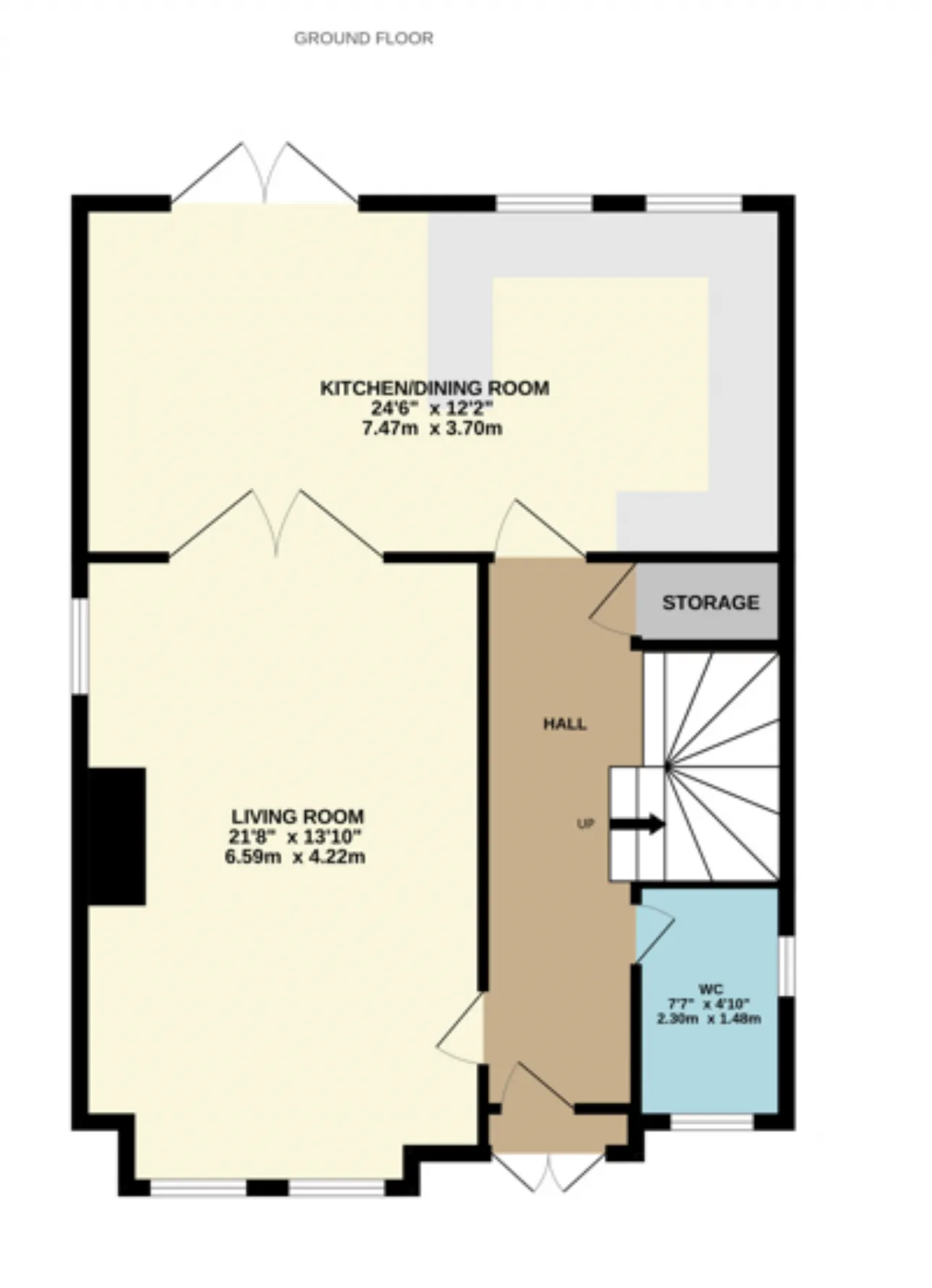 Living / Dining Room 6.6m x 4.23m Off the hallway lies a spacious living room with dual-aspect windows that fill the space with natural light. The room features decorative panelling, a radiator cover, and double doors leading to the kitchen. A feature fireplace with a limestone mantelpiece adds a charming to the room.