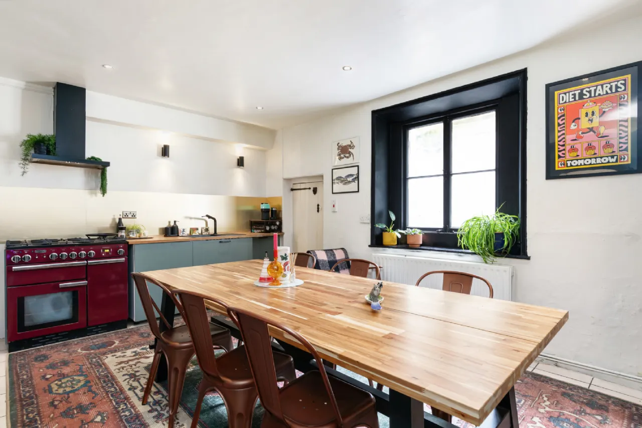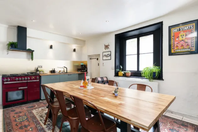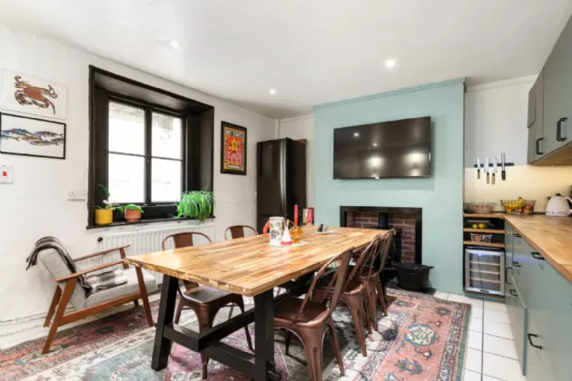 Kitchen 5.2m x 4m The kitchen is located at garden level and is a large space with a great range of fitted floor and wall units with solid timber countertops. The floor is tiled and a pretty feature is an original fireplace with fitted solid fuel stove. There is plenty of room for a large dining table.