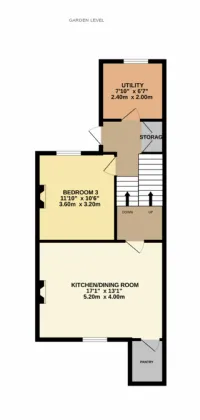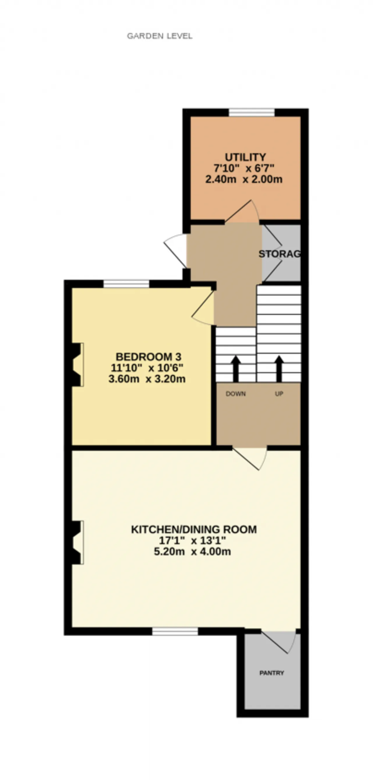 Bedroom 3 3.6m x 3.2m Located at garden level this is a lovely bright bedroom with light flooding through the sash window with original shutters. The ceiling is high and original features have been retained such as cast iron fireplace, polished wooden floor, picture rails, ceiling covings and rose.