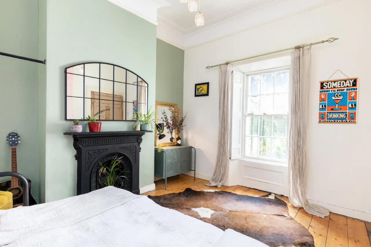 Bedroom 2 4m x 3.4m Generous sized double room with cast iron fireplace, polished wooden floor and ceiling covings.