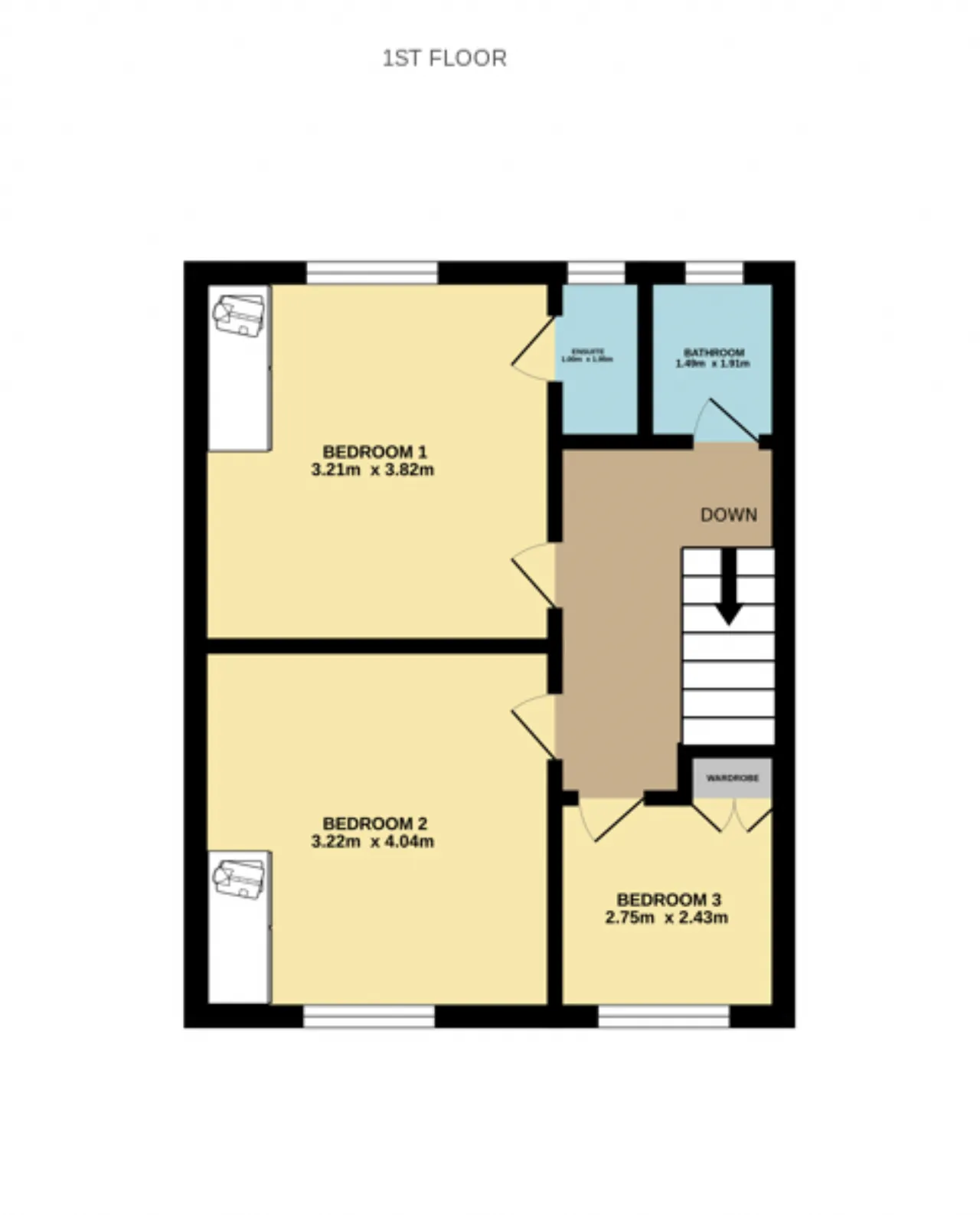 Bedroom 2 3.22m x 4.04m Double room to the front with carpet flooring and fitted wardrobes.