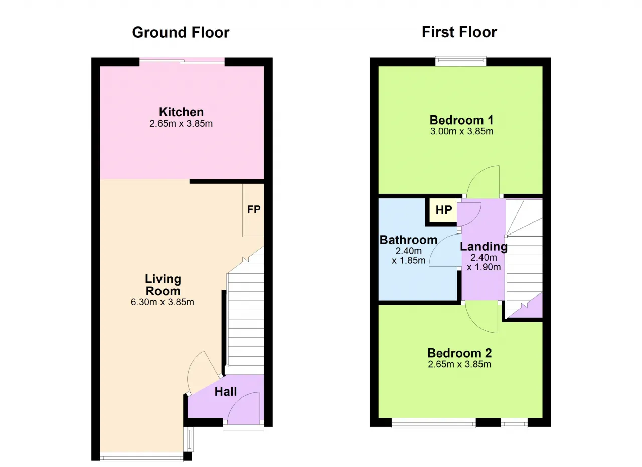 The accommodation comprises of a light-filled living room with a feature open fireplace with a brick surround which opens through a sleek-fitted kitchen which overlooks an attractively landscaped rear garden. At first floor level, there are two double bedrooms and an updated family bathroom.