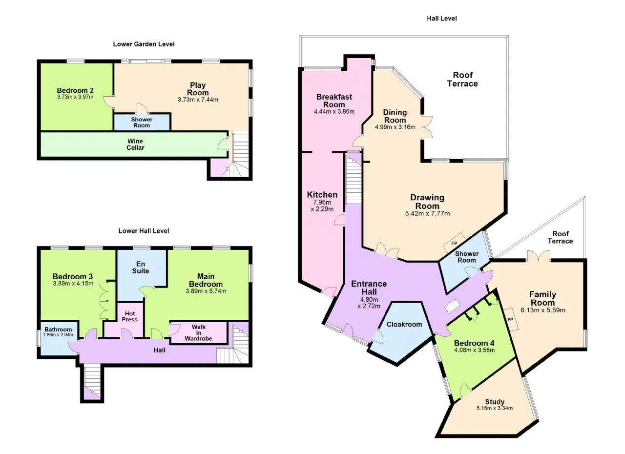 At garden level, you'll find a versatile playroom with French doors leading to the sun-soaked gardens, a fourth double bedroom, and an additional shower room. A wine cellar/storage area accessed from the stairwell.