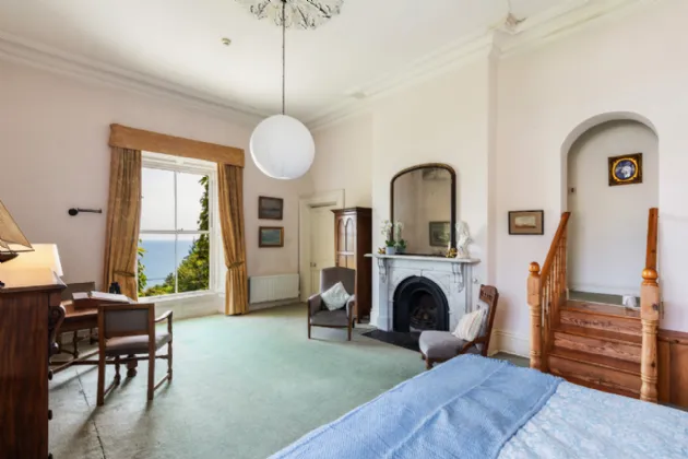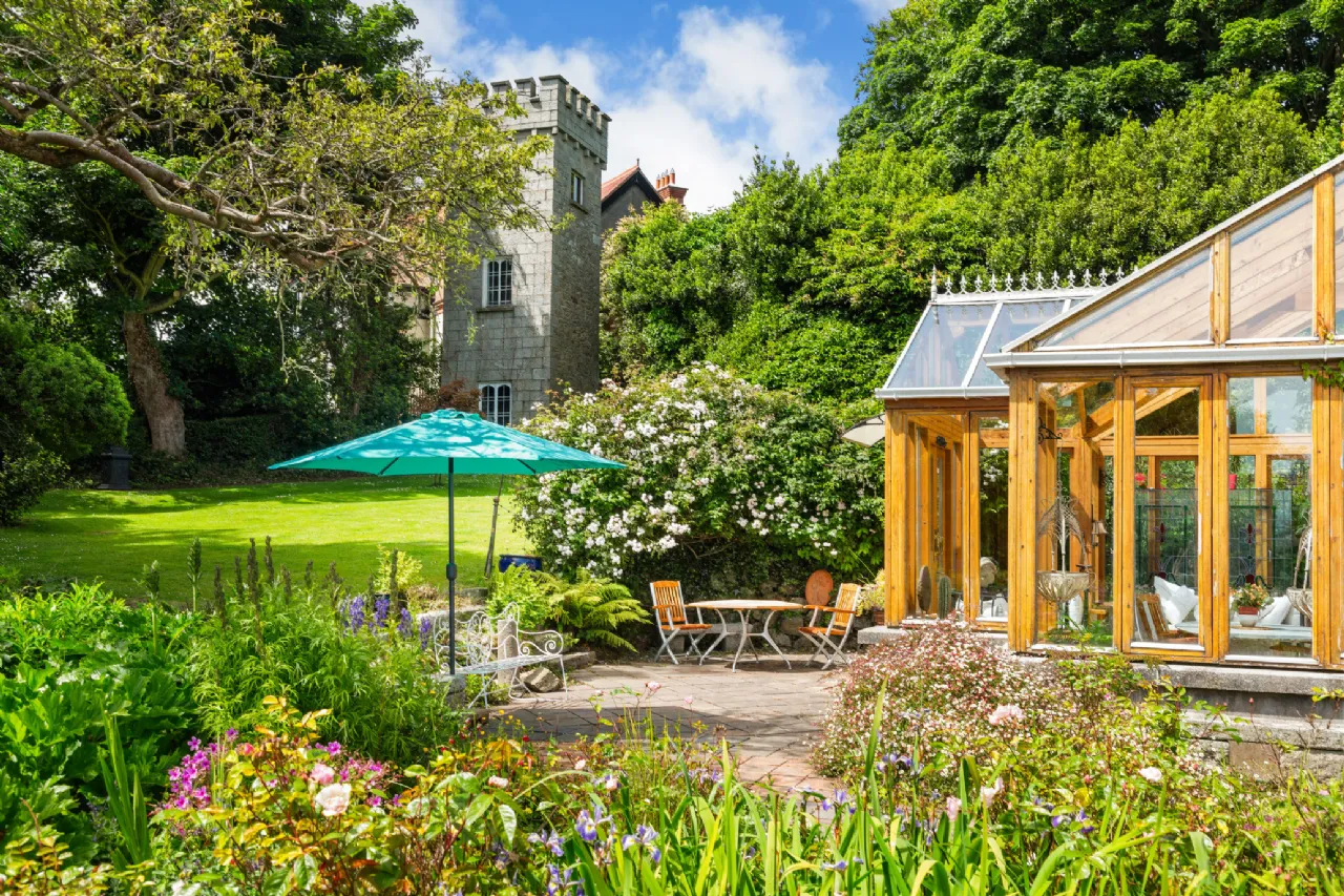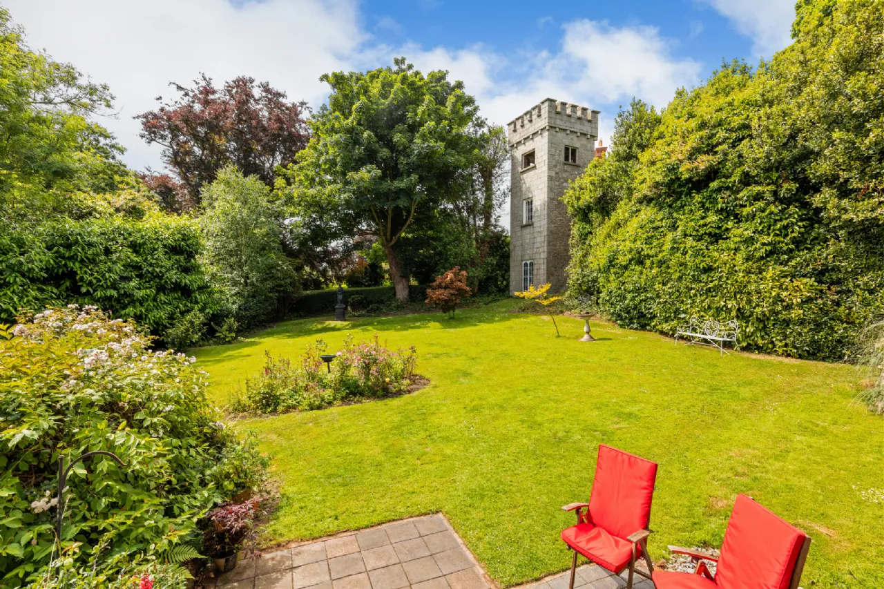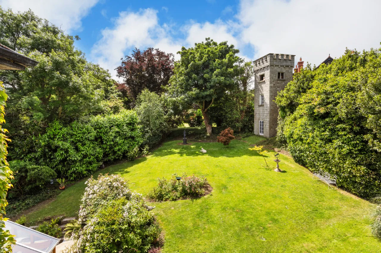 The breathtaking views over Killiney Bay are complimented by the property’s enchanting grounds, which feature a selection of mature plants and shrubs, including old roses, hydrangeas, cranesbill, lobelia, and fruit trees. A lawned tennis court at the rear awaits restoration, while the distinctive granite tower, known as "Spite Tower," adds unique character and potential for various uses.